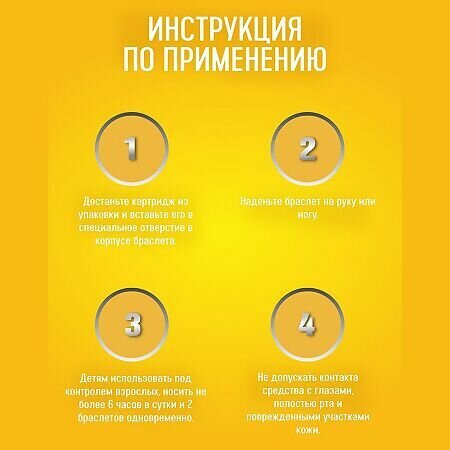| Состав | картридж - цитронелловое, лавандовое, гераниевое, мятное эфирные масла (30%), термопластичная резина; браслет - силикон, металл. |
