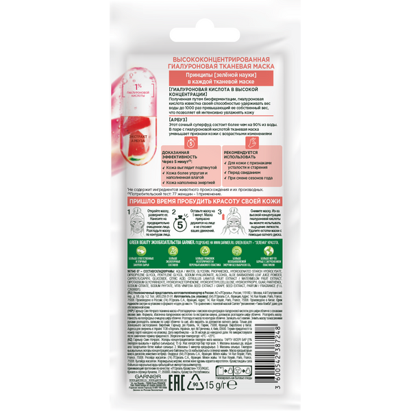 На сегодняшний день товар «Маска для лица Garnier Подтягивающая Высококонцентрированная гиалуроновая 15г Маска для лица Garnier Высококонцентрированная для кожи с возрастными изменениями тканевая 15 г» можно купить с кешбеком в 1 магазине: Яндекс.Маркет