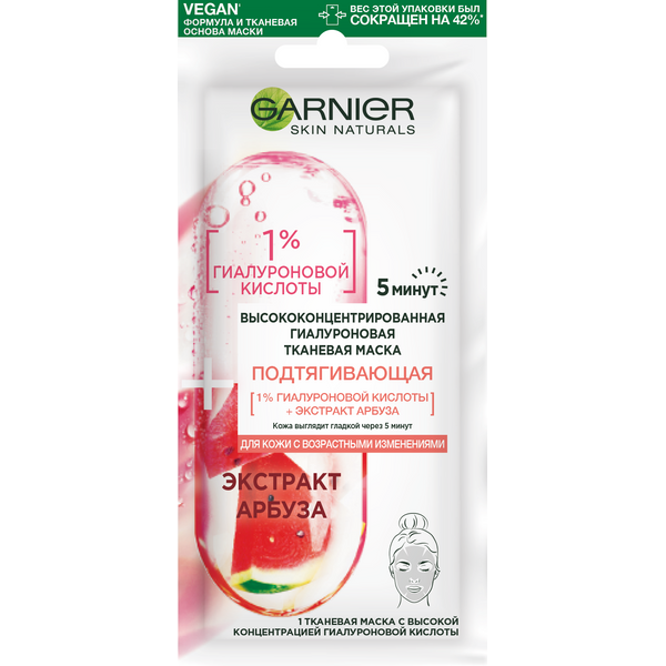 Маска для лица Garnier Подтягивающая Высококонцентрированная гиалуроновая 15г Маска для лица Garnier Высококонцентрированная для кожи с возрастными изменениями тканевая 15 г