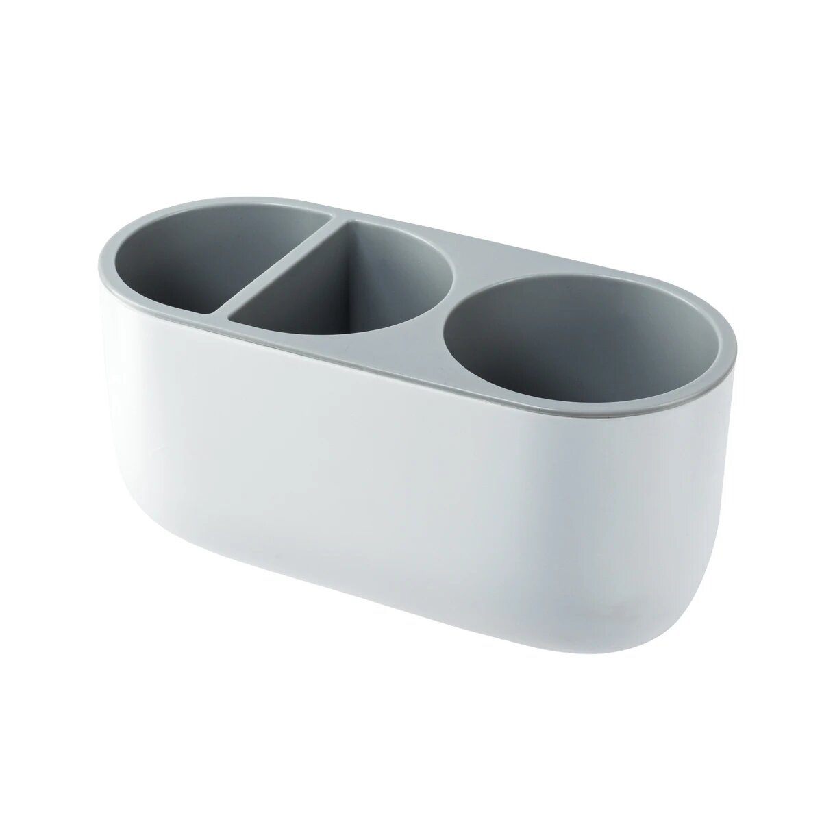 Настенный держатель отлично подойдет для ванной в современном стиле. Он выполнен из прочного пластика в нейтральной бело-серой расцветке, сочетает в себе компактность и вместительность, универсален в применении, практичен в уходе. Держатель имеет 3 отделения, разграниченных вертикальными перегородками. В нем удобно хранить тюбики с пастой, зубные щетки, бритвенные станки и другие гигиенические принадлежности, которые всегда должны быть под рукой. Приспособление крепится на клейкую ленту, его легко установить и столь же просто демонтировать: инструменты не нужны, стены сверлить не придется.