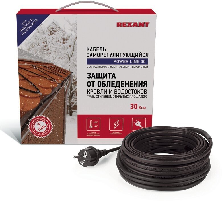 Комплекты саморегулирующегося кабеля POWER Line 30SRL-2CR REXANT предназначены для защиты от замерзания бытовых трубопроводов, счетчиков воды, вентилей, а так же могут использоваться для обогрева кровли и водостоков. Нагревательный кабель соединенс питающим кабелем, на конце которого находится евро-вилка для подключения в розетку с заземлением. Нагревательный кабель является саморегулирующимся и в нормальных условиях его температура не превышает 60oC. Комплекты подходят для использования, как в помещениях, так и на улице. Кабель может быть смонтирован на поверхности как металлической, так и пластиковой трубы, под теплоизоляцией. Кабель может пересекаться сам с собой.