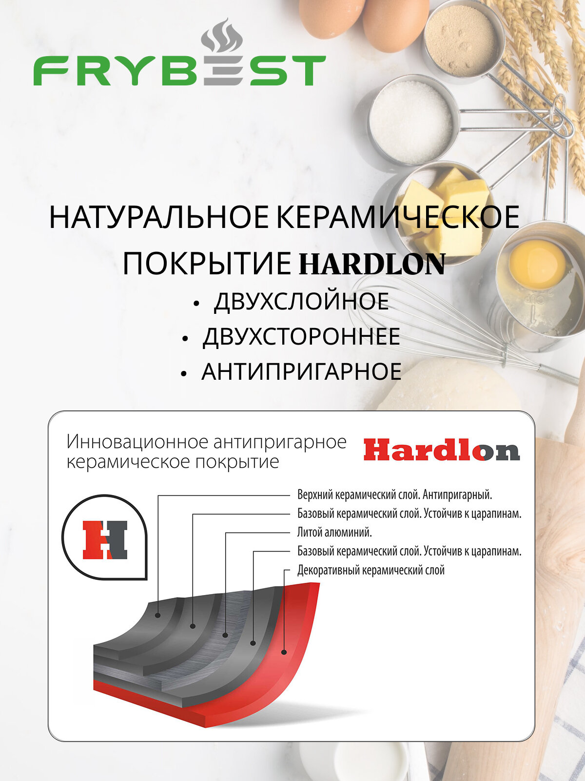 Двухслойное, двустороннее, экологически чистое керамическое покрытие HARDLON, в составе которого только натуральные компоненты, камни и песок, обеспечивает максимальную безопасность приготовления пищи и имеет устойчивость к царапинам в 2,5 раза выше, чем покрытие прошлого поколения!