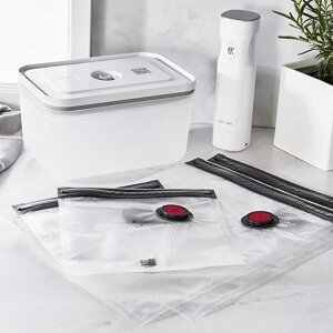 Инновационный вакуумный насос удаляет воздух из контейнеров и пакетов и сохраняет ароматы, витамины и питательные вещества. Ваши продукты и блюда будут оставаться свежими до пяти раз дольше, чем при обычном хранении! Помимо высококачественного ручного вакуумного насоса, в комплект входят два сверхлёгких пластиковых контейнера ёмкостью 400 мл и 1,1 л, а также четыре вакуумных пакета - два по 1,25 литра и два по 4 литра. Все вакуумные контейнеры и пакеты подходят для использования в холодильнике и морозилке, а также для разогрева продуктов и блюд в микроволновой печи.