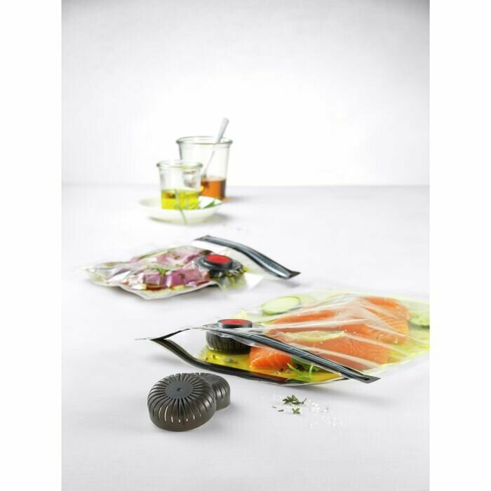 Инновационный вакуумный насос удаляет воздух из контейнеров и пакетов и сохраняет ароматы, витамины и питательные вещества. Ваши продукты и блюда будут оставаться свежими до пяти раз дольше, чем при обычном хранении! Помимо высококачественного ручного вакуумного насоса, в комплект входят два контейнера из боросиликатного стекла ёмкостью 350 мл и 900 мл, а также четыре вакуумных пакета - два по 1,25 литра и два по 4 литра. Все вакуумные контейнеры и пакеты подходят для использования в холодильнике и морозилке, а также для разогрева продуктов и блюд в микроволновой печи.