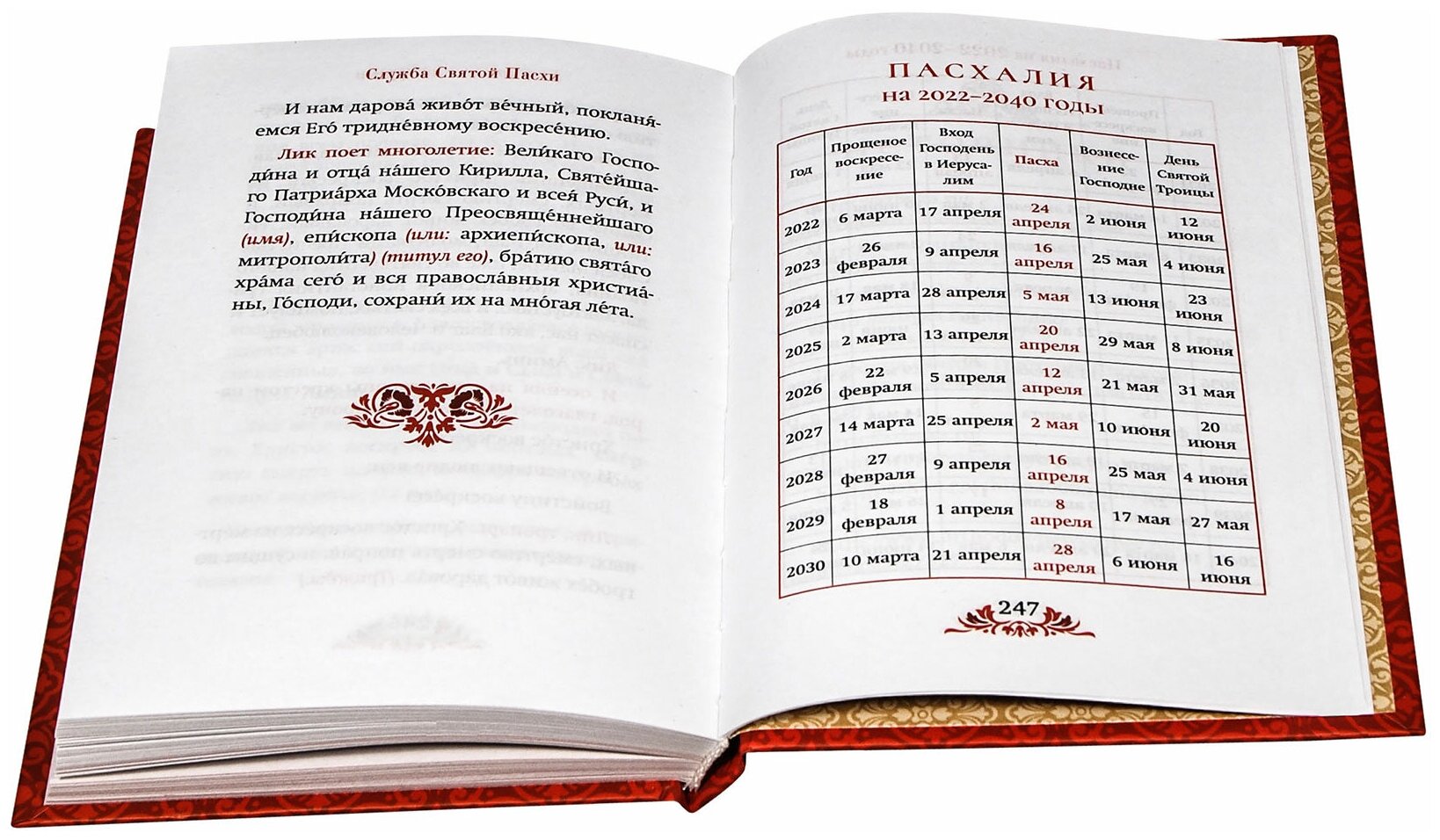 В конце книги есть Пасхалия до 2040 года, которая даст возможность многим верующим видеть даты великопостного и пасхального циклов, в том числе и дни празднования самой Святой Пасхи, на многие годы.