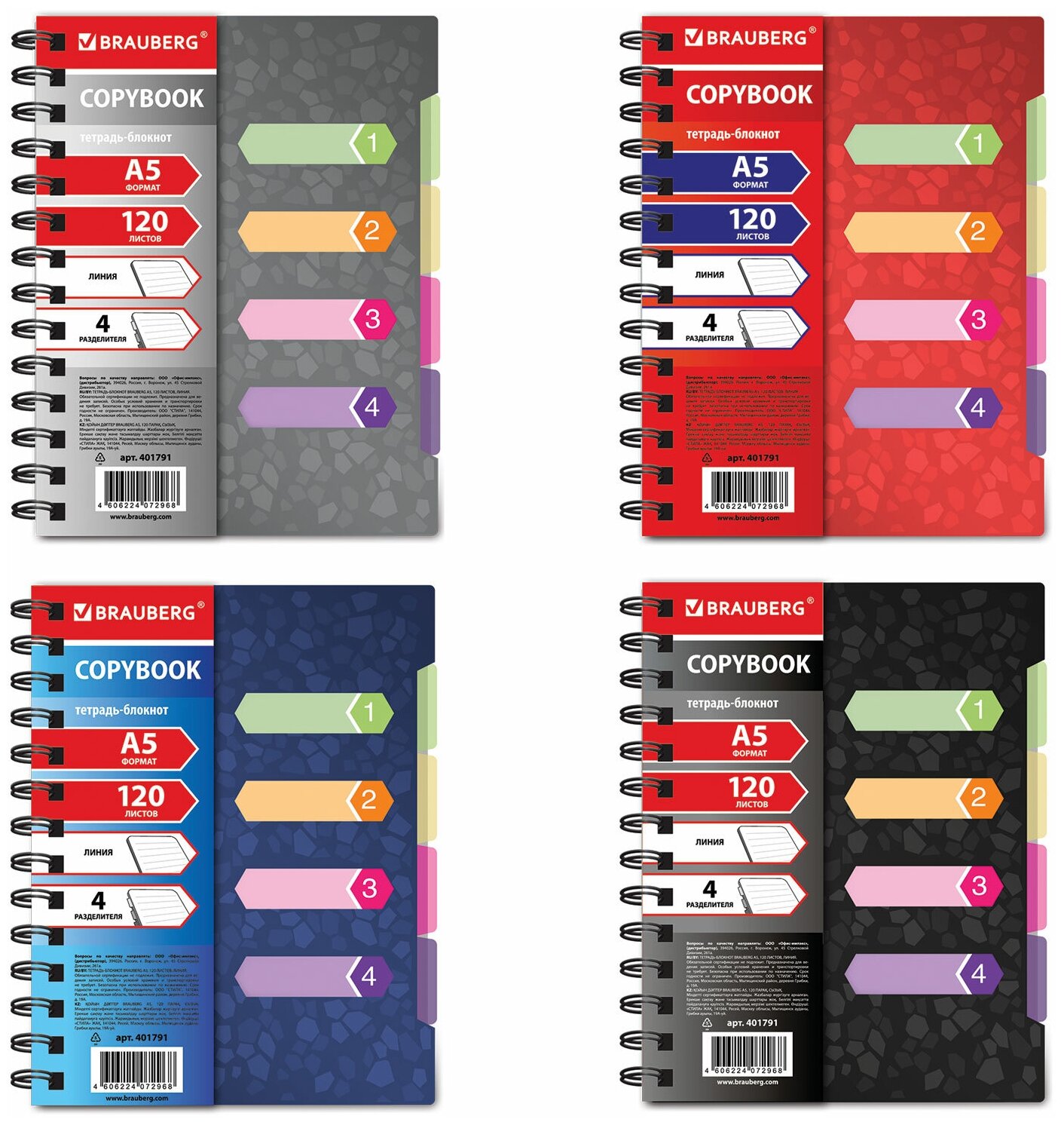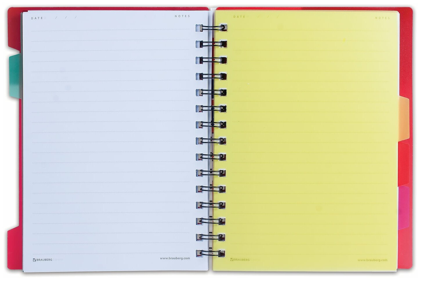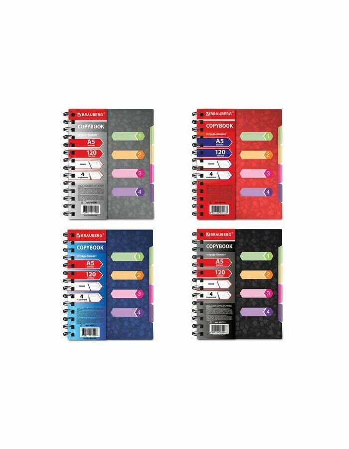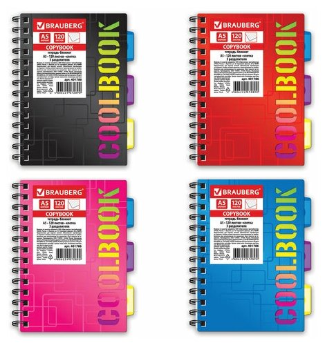 Пластиковая обложка надежно защитит внутренний блок от повреждений. Внутренний блок содержит 120 листов офсетной бумаги плотностью 65 г/м2 и белизной 100%. Линовка блока - в линию. Тетрадь снабжена четырьмя пластиковыми, съемными разделителями. Листы соединены евроспиралью. Формат А5.