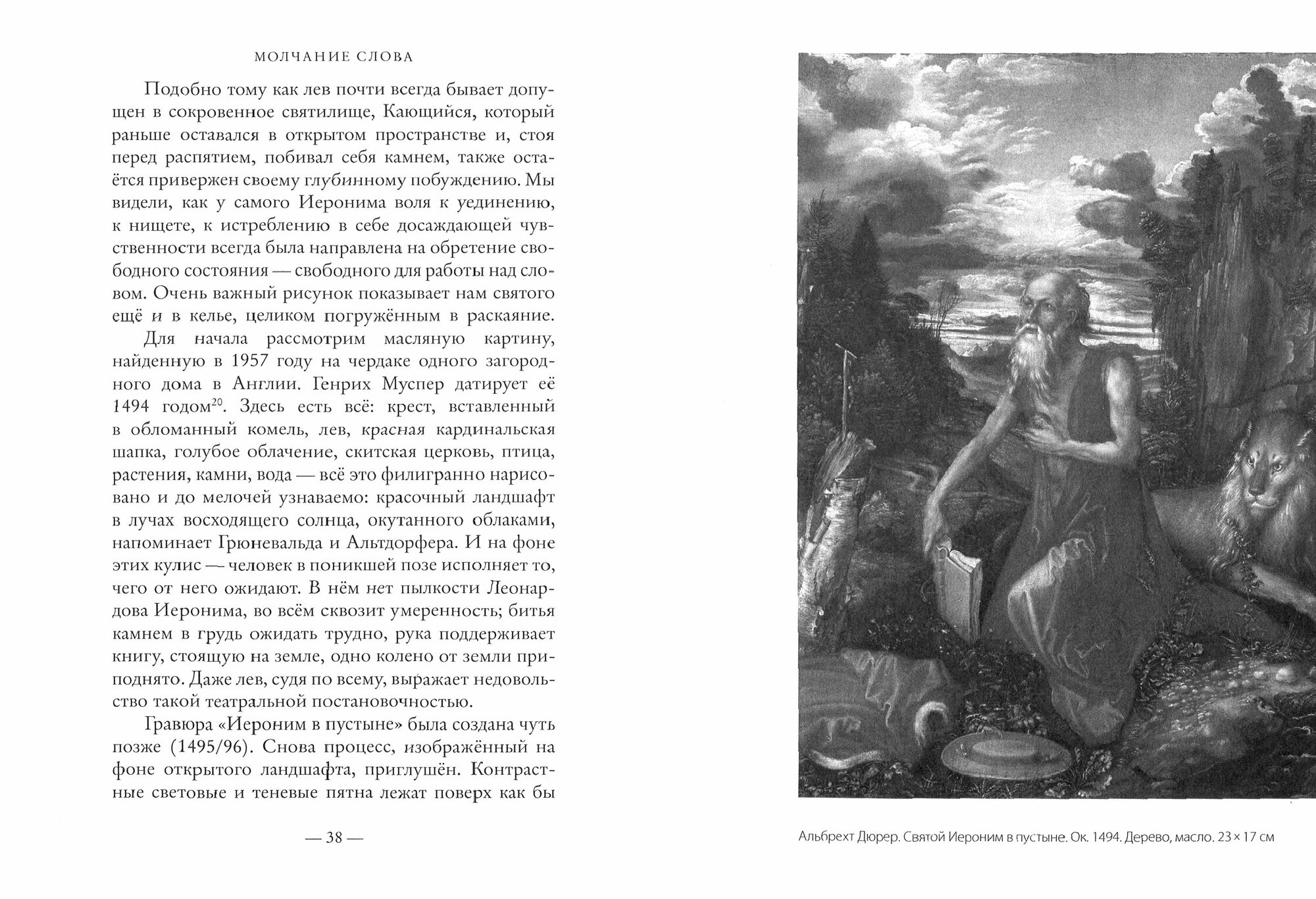 Основу текста швейцарского богослова Ханса Урса фон Бальтазара (1905-1988) об образе св. Иеронима Стридонского, каким его понял и воплотил Альбрехт Дюрер, составляет лекция, прочитанная автором к 500-летию художника (Нюрнберг, 1971). Бальтазар с позиции христианского мыслителя и искусствоведа исследует, как эволюционирует у Дюрера восприятие жизненного и теологического подвига великого филолога, создателя канонического латинского текста Библии. Прослеживается исчерпывающий ряд работ мастера от самых ранних до шедевра "Святой Иероним в келье", относящегося к циклу "Мастерских гравюр".