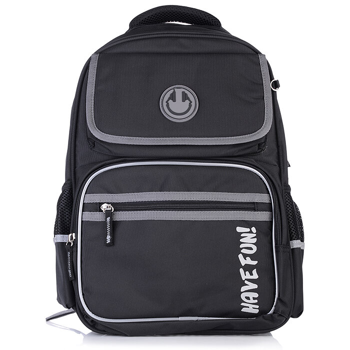 Рюкзак школьный. СМАЙЛ. Размер: 30х42,5х15,5 см. Материал: полиэстер. Количество отделений - 1. Внутренняя организация: один открытый карман. Застёжка - молния. Материал собачки: лента репсовая. Форма собачки: хляст. Количество наружных карманов - 4. Тип спинки - формоустойчивая жесткая спинка из сетчатой ткани и поролона. Тип дна - с пластиковыми ножками. Отделка: резиновая нашивка, шелкография в одну краску. Цвет - черный. Особенности: водоотталкивающая ткань, лямки, регулируемые по длине, светоотражающие элементы. Подклада: брендированная подклада. Индивидуальная упаковка: ПЭТ-пакет с ручкой.