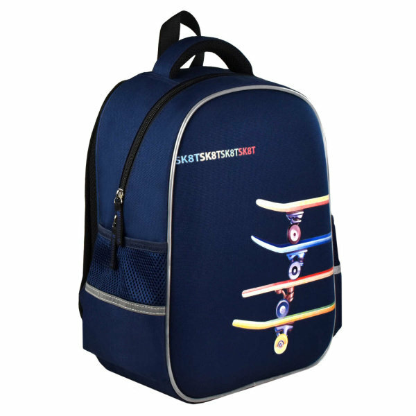 Ранец школьный. СКЕЙТБОРДЫ. Размер: 27,5x37,5x14,5 см. Материал: полиэстер, ЭВА панель. Количество отделений - 1. Внутренняя организация: мягкие разделители, резинка-фиксатор, сетчатый карман. Застёжка - молния. Материал собачки: лента репсовая. Форма собачки: хляст. Количество наружных карманов - 2. Тип спинки - формоустойчивая спинка из сетчатой ткани и поролона. Тип дна - с пластиковыми ножками. Отделка: цифровая печать. Цвет - синий, черный. Особенности: водоотталкивающая ткань, лямки, регулируемые по длине, светоотражающие элементы. Подклада: брендированная подклада. Индивидуальная упаковка: ПЭТ-пакет.