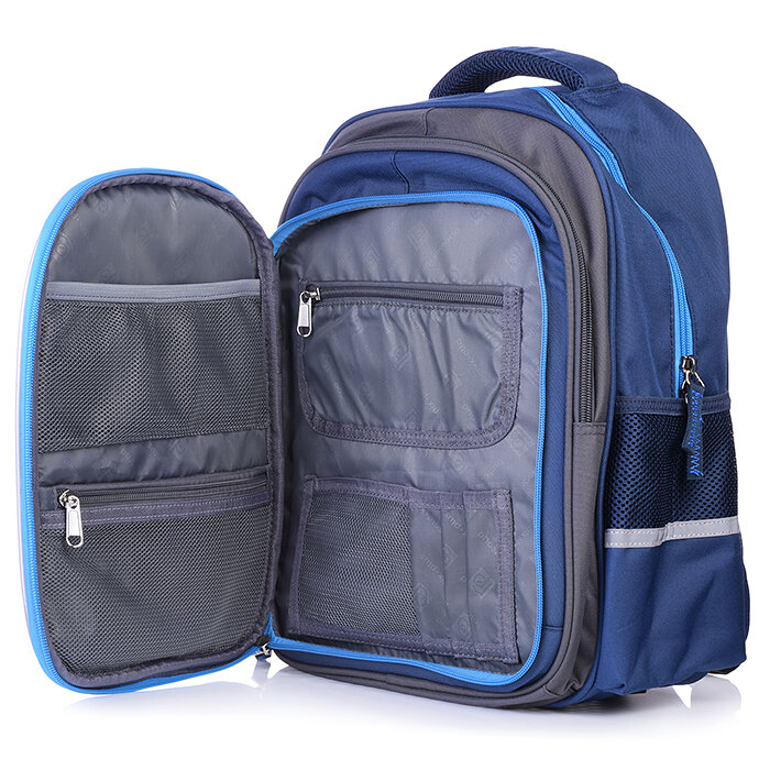 Рюкзак школьный. СКЕЙТ ТРЮК. Размер: 29х38.5х13.5 см. Материал: полиэстер. Количество отделений - 2. Внутренняя организация: карман на резинке, органайзер для канцелярских принадлежностей. Застёжка - молния. Материал собачки: лента репсовая. Форма собачки: хляст. Количество наружных карманов - 3. Тип спинки - формоустойчивая спинка из сетчатой ткани и поролона. Тип дна - с пластиковыми ножками. Отделка: высокая печать. Цвет - серый, синий. Особенности: водоотталкивающая ткань, лямки, регулируемые по длине, светоотражающие элементы, фронтальный карман с удобной конструкцией и дополнительными отделениями для канцелярских принадлежностей. Подклада: брендированная подклада. Индивидуальная упаковка: ПЭТ-пакет.