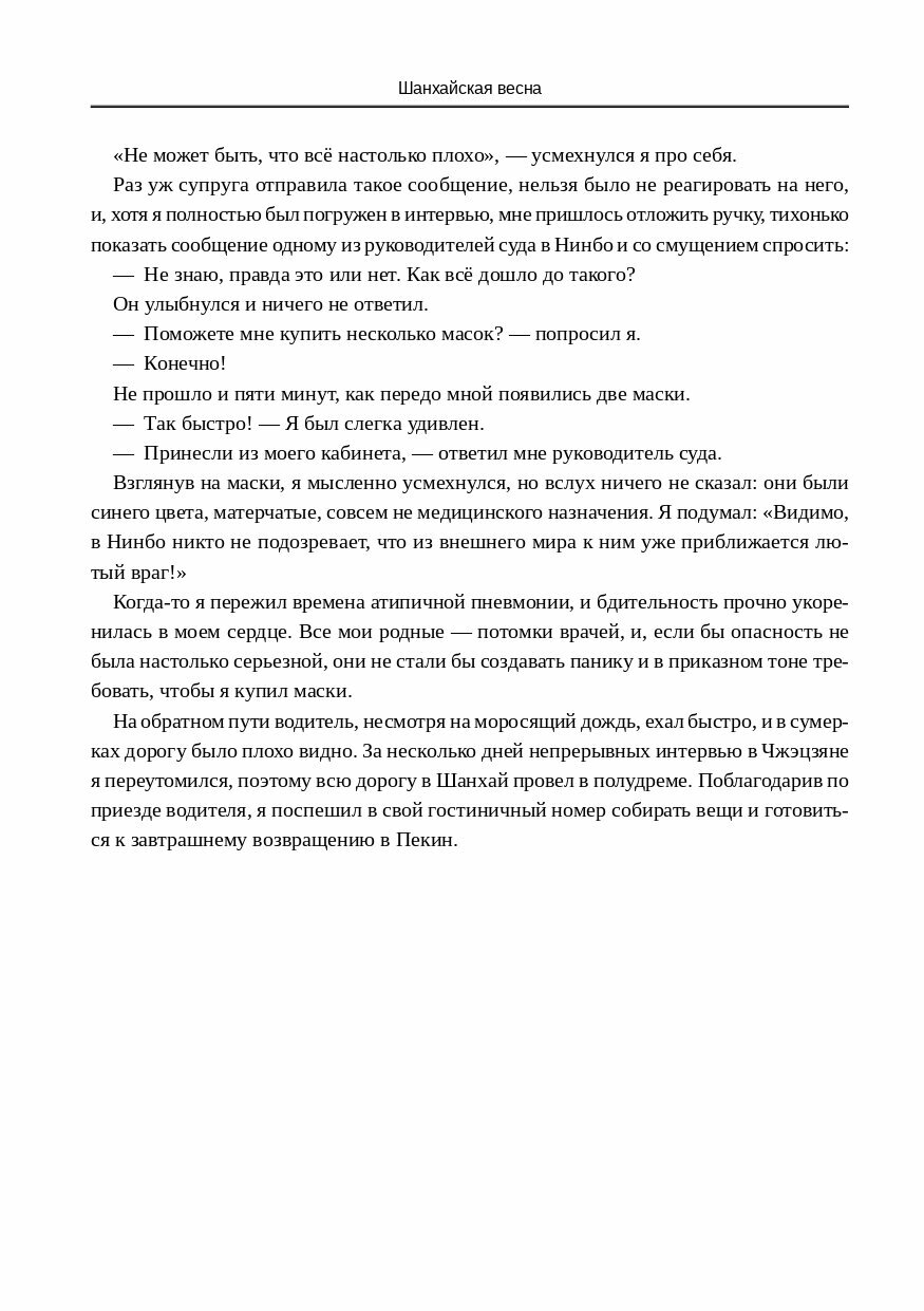 В документальных очерках автор описывает свое пребывание в Шанхае в начальный период распространения эпидемии коронавируса в Китае в 2020 году. В центре внимания автора — жизнь горожан, оказавшихся в экстремальной ситуации. Наблюдая за кампанией по борьбе с коронавирусом, он убеждается в том, что успешное сдерживание эпидемии возможно только при наличии здравого смысла и твердой гражданской позиции у властей и населения. Особенно ярко это проявилось среди врачей, которые оказались способны с максимальной ответственностью подойти к решению нестандартных социальных задач.