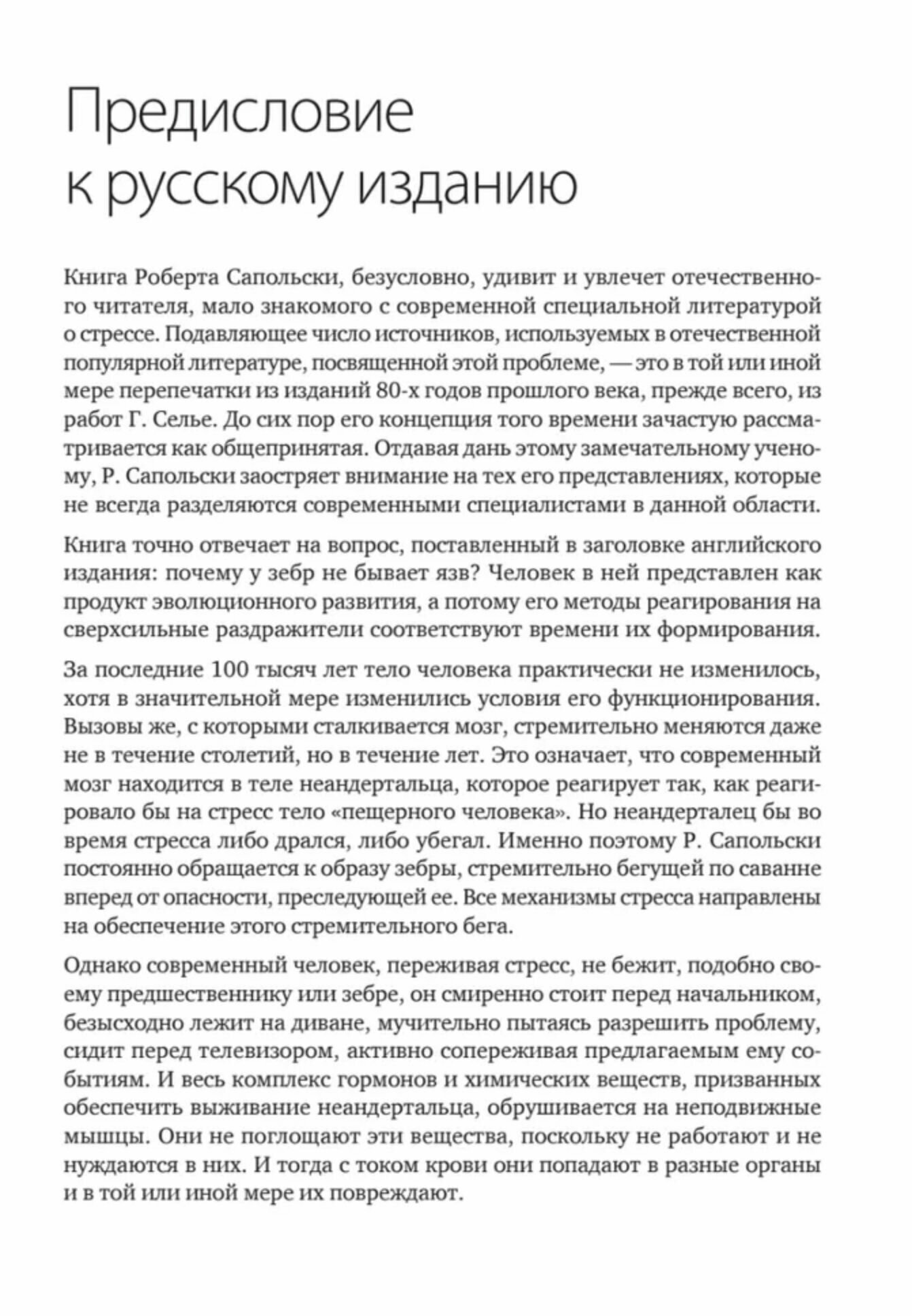 В оригинале книга называется "почему у зебр не бывает язв", так как врачи прошлого связывали это заболевание с высоким уровнем стресса. Как оказалось, не всё так однозначно. В книге подробно расписано как реагируют на стресс различные органы и к чему это приводит в долгосрочной перспективе. Не самое простое чтение, так как в обилии названий различных гормонов не так то просто сориентироваться, но свойственный автору лёгкий стиль изложения приправленный юмором делает книгу увлекательной. В качестве рекомендации можно процитировать самого Сапольски: "Я верю, что в сегодняшнем мире научные знания полезны любому человеку, как бы ни старались школьные учителя внушить нам к ним отвращение."
