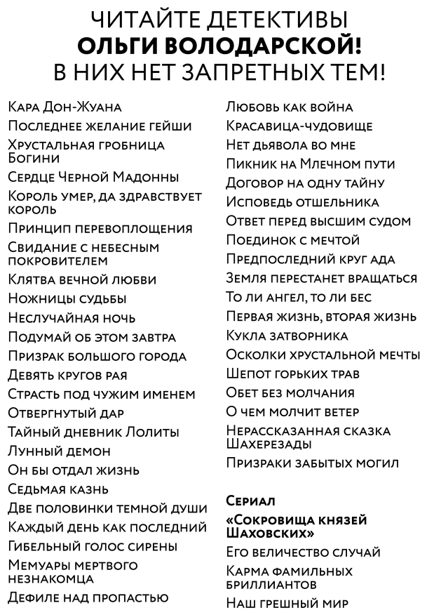 | Серия | Никаких запретных тем! Остросюжетная проза О. Володарской. Новое оформление (обложка) |