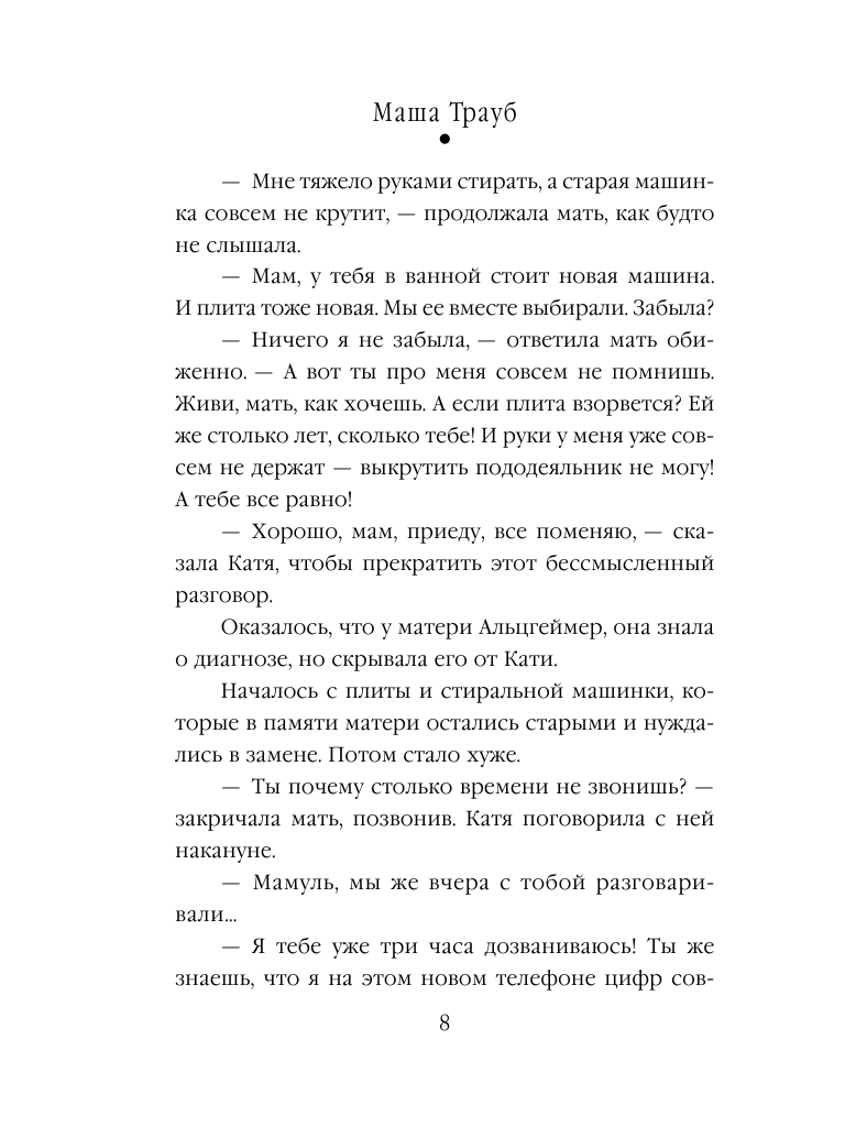 Приятная проза для любителей произведений в стиле Марии Метлицкой или Виктории Токаревой. Всегда интересно наблюдать за наивными, нелепыми и обаятельными героинями Маши Трауб. Чисто женские истории, запутанные женские судьбы. Когда немного грустно или печально, книга поможет поднять настроение пониманием того, что мы все не одиноки в своих столкновениях с трудностями, но выход всегда есть...