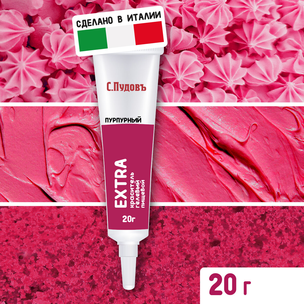 "С.Пудовъ" представляет линию ярких гелевых пищевых водорастворимых красителей EXTRA. Мы производим их в Италии из экологически чистого сырья. Натуральные и яркие кондитерские гелевые красители идеально подходят для: торт красный бархат, торта, макаронс, макарун, глазури, безе, мастики, печенья, кексов, крема, маффинов, бисквита, мороженого, суфле, желе, яиц марципана, пряников, айсинга, мыла, слаймов, эпоксидной смолы. Гели-красители "С.Пудовъ" термостабильны, а значит они подходят для десертов, которые вы готовите в духовке. Преимущества гелевых красителей "С.Пудовъ": Высокая концентрация. Достаточно нескольких капель для получения насыщенного цвета. Без запаха и вкуса. Не меняет структуру продукта, после добавления в него красителя. Идеально подходит для любого теста. Можно использовать для взбитых сливок, фростинга и любого крема на масляной основе. Европейское качество. Удобная, эргономичная упаковка.
