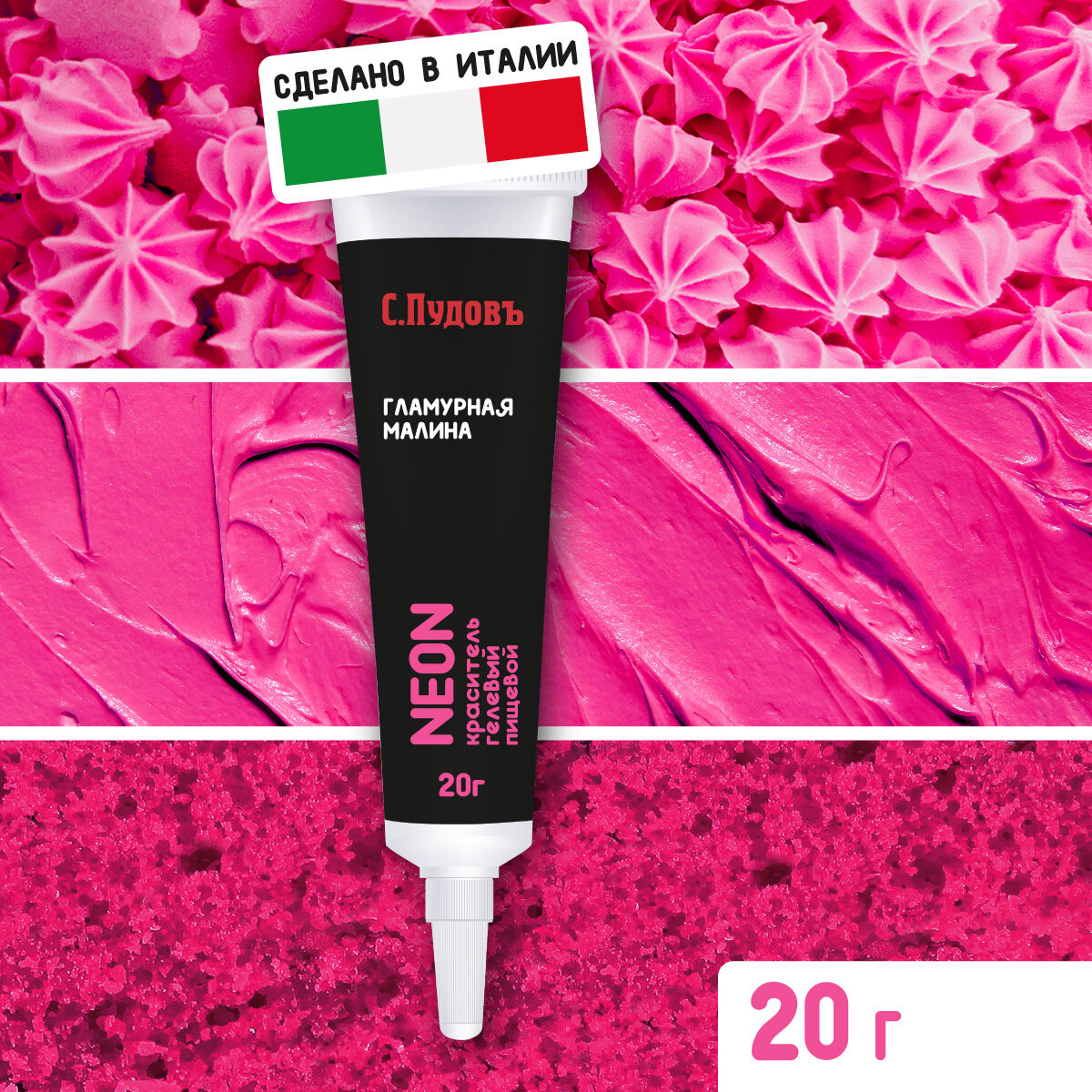"С.Пудовъ" представляет линию ярких гелевых пищевых водорастворимых красителей NEON. Мы производим их в Италии из экологически чистого сырья. Натуральные и яркие кондитерские гелевые красители идеально подходят для: торт красный бархат, торта, макаронс, макарун, глазури, безе, мастики, печенья, кексов, крема, маффинов, бисквита, мороженого, суфле, желе, яиц марципана, пряников, айсинга, мыла, слаймов, эпоксидной смолы. Гели-красители "С.Пудовъ" термостабильны, а значит они подходят для десертов, которые вы готовите в духовке. Преимущества гелевых красителей "С.Пудовъ": Высокая концентрация. Достаточно нескольких капель для получения насыщенного цвета. Без запаха и вкуса. Не меняет структуру продукта, после добавления в него красителя. Идеально подходит для любого теста. Можно использовать для взбитых сливок, фростинга и любого крема на масляной основе. Европейское качество. Удобная, эргономичная упаковка.