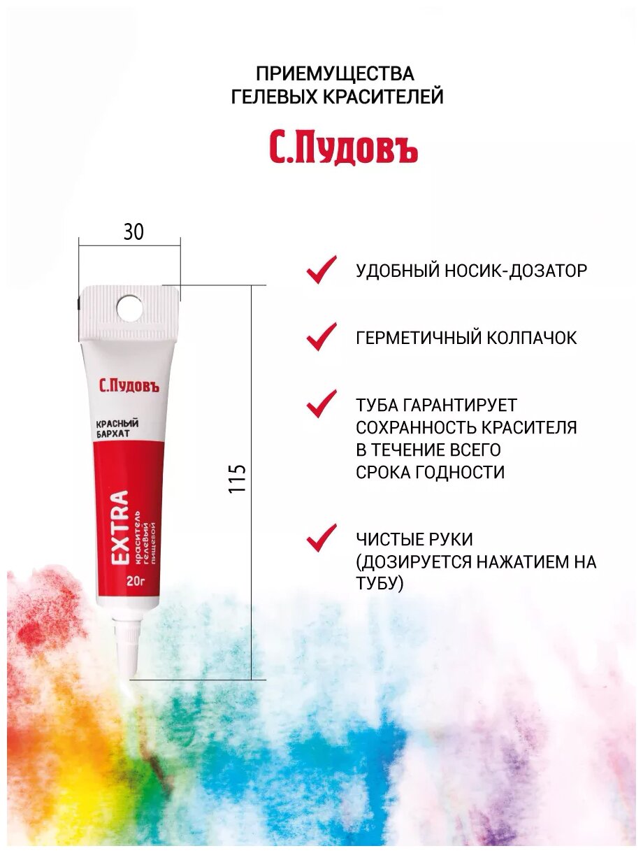 "С.Пудовъ" представляет линию ярких гелевых пищевых водорастворимых красителей PASTEL. Мы производим их в Италии из экологически чистого сырья. Натуральные и яркие кондитерские гелевые красители идеально подходят для: торт красный бархат, торта, макаронс, макарун, глазури, безе, мастики, печенья, кексов, крема, маффинов, бисквита, мороженого, суфле, желе, яиц марципана, пряников, айсинга, мыла, слаймов, эпоксидной смолы. Гели-красители "С.Пудовъ" термостабильны, а значит они подходят для десертов, которые вы готовите в духовке. Преимущества гелевых красителей "С.Пудовъ": Высокая концентрация. Достаточно нескольких капель для получения насыщенного цвета. Без запаха и вкуса. Не меняет структуру продукта, после добавления в него красителя. Идеально подходит для любого теста. Можно использовать для взбитых сливок, фростинга и любого крема на масляной основе. Европейское качество. Удобная, эргономичная упаковка.
