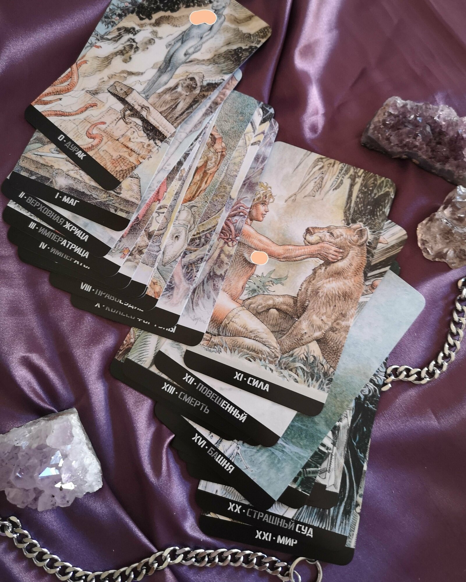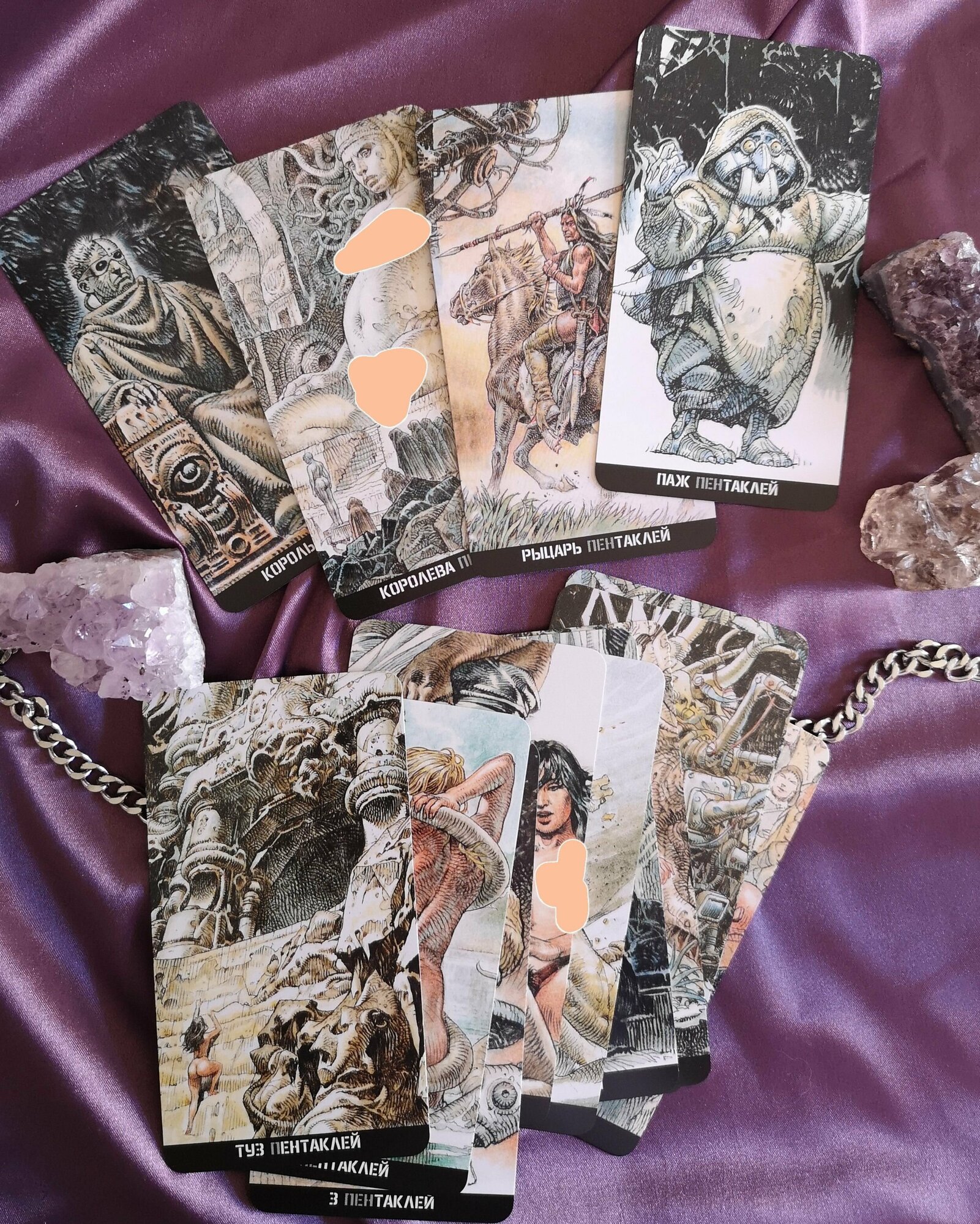 Ну это уже совсем ни в какие ворота. Картон тонкий настолько, что это уже можно назвать бумагой. Покрытия никакого. Карты безрамочные. Но с какого перепугу ЭТО назвали Таро, я не понимаю. Картинки вообще не соответствуют классическим арканам. Как и в Таро Гюстава Доре. ВООБЩЕ. Бессмысленное нагромождение голых телес. Это красиво конечно, но абсолютно неуместно.