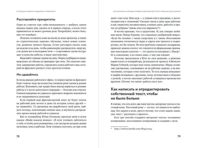 Будет полезно и тем, кто не хочет писать тексты сам. Автор полностью раскрывает порядок работы копирайтера, зону ответственности и задачи.