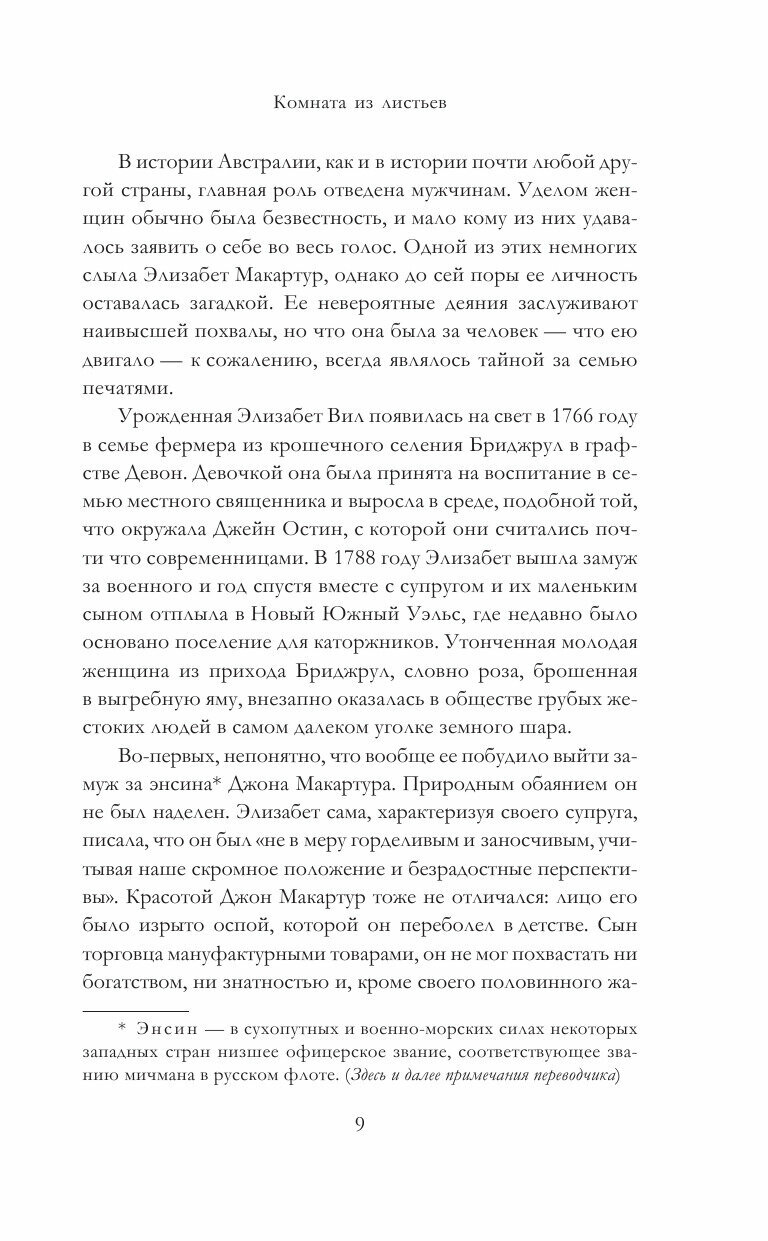 Джон Макартур — важнейшая фигура в истории Австралии XIX века. Этот скандально известный предприниматель считается «отцом шерстяного овцеводства». Но какую роль в этом успехе сыграла его жена, Элизабет Макартур? И что бы она написала в мемуарах, если бы таковые существовали? Брак с безжалостным тираном, стремление к недоступной для женщины власти в обществе… «Комната из листьев» — попытка представить себе такие воспоминания.