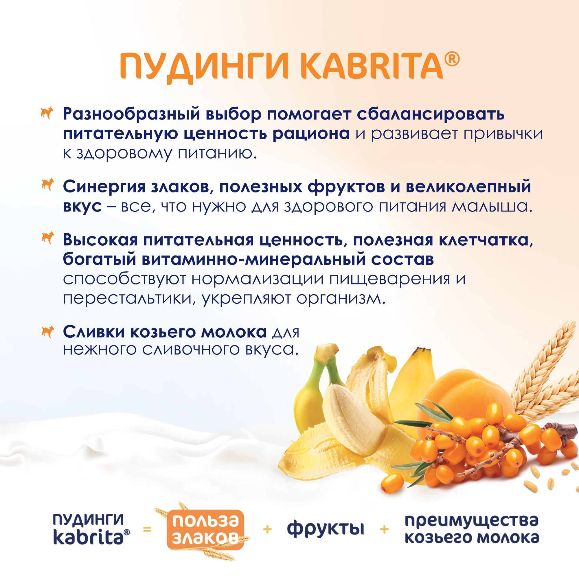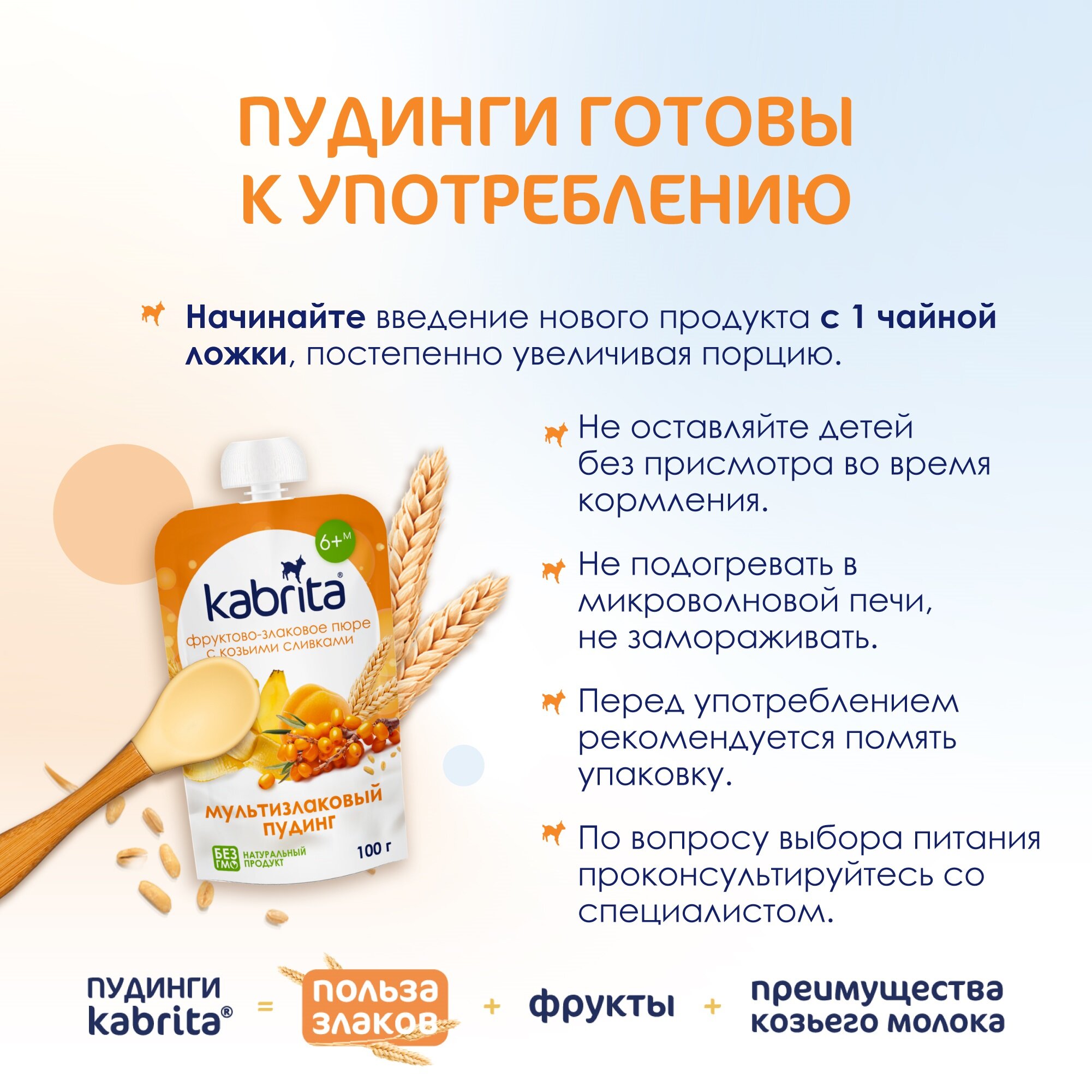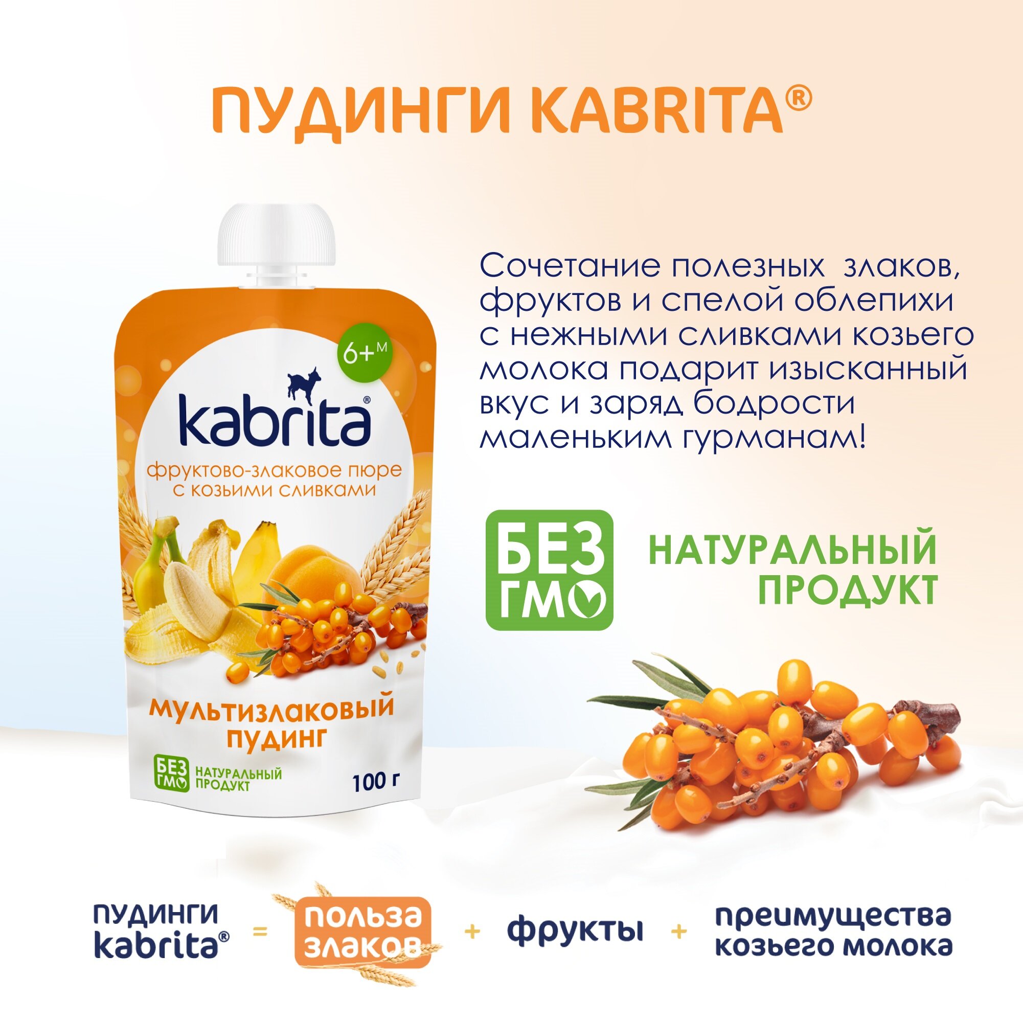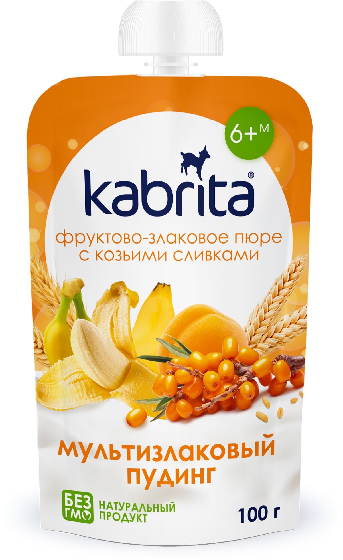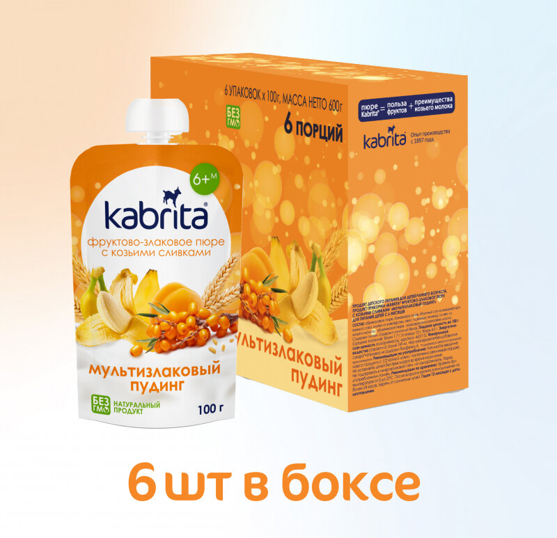 Kabrita Мультизлаковый пудинг с облепихой (Фруктово-злаковое пюре с козьими сливками). Возраст введения: с 6 месяцев. Благодаря голландским фермерским традициям и многолетнему опыту производства (с 1897 года), Kabrita предлагает современное высококачественное детское питание из козьего молока.