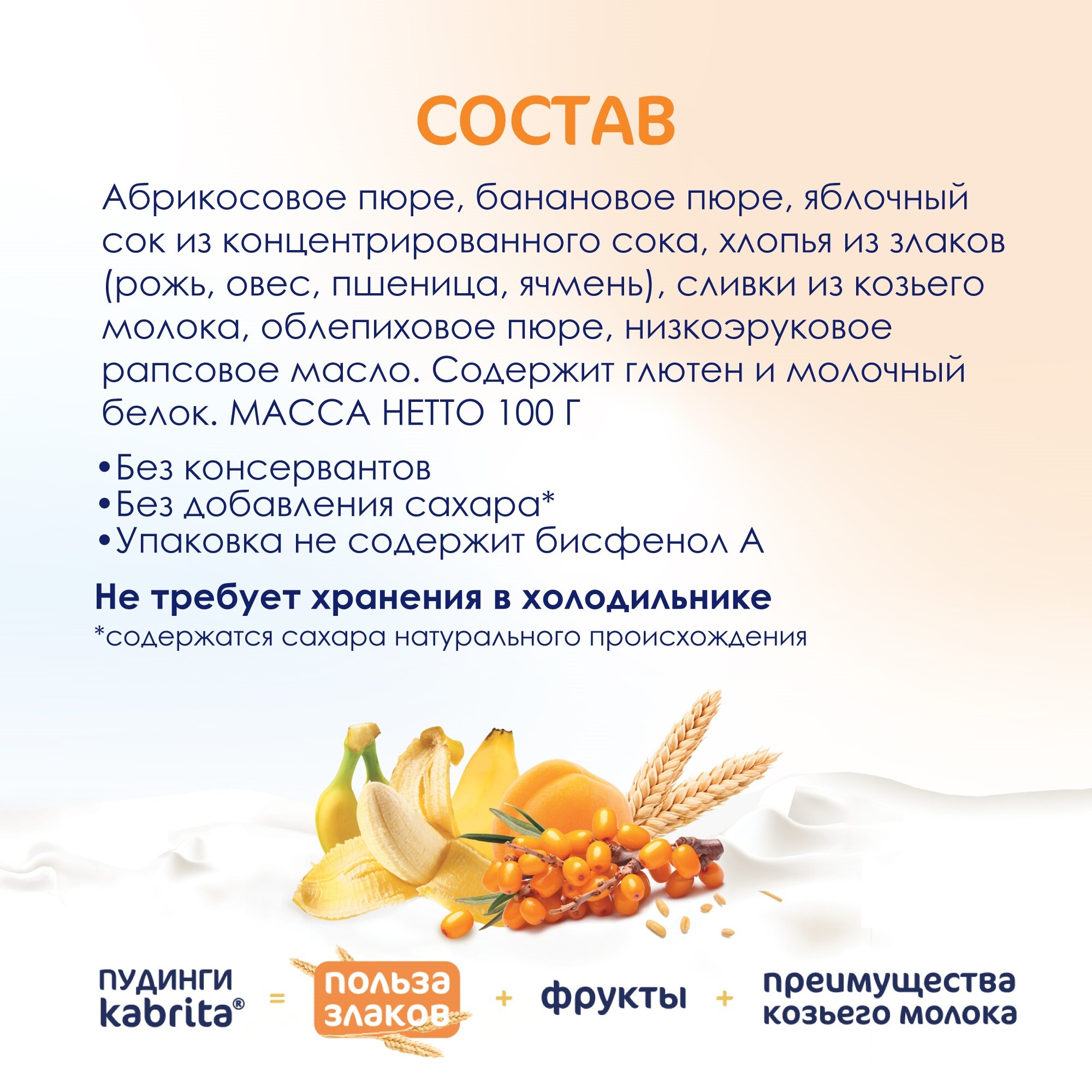 | Состав | Абрикосовое пюре, банановое пюре, яблочный сок из концентрированного сока, хлопья из злаков (рожь, овес, пшеница, ячмень), сливки из козьего молока, облепиховое пюре, низкоэруковое рапсовое масло |