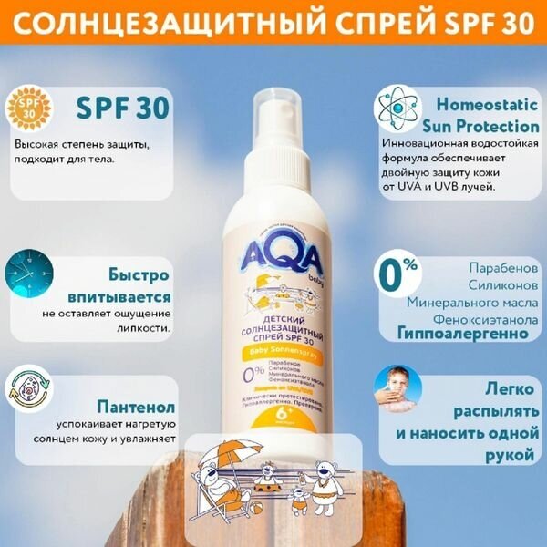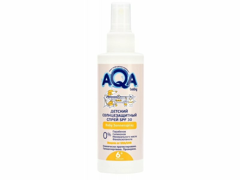 Спрей солнцезащитный AQA baby детский SPF 30. Надежная защита от солнца для самой нежной кожи Вашего малыша уже с 6 месяцев. Инновационная водостойкая формула Homeostatic Sun Protection обеспечивает двойную защиту кожи от UVA и UVB лучей. Спрей удобен в применении, легко распыляется, быстро впитывается, не оставляет ощущение липкости и белых следов на коже. Пантенол способствует питанию и увлажнению кожи, препятствует появлению сухости и шелушений.Состав: Aqua, Ethylhexyl Methoxycinnamate, Diethylamino Hydroxybenzoyl Hexyl Benzoate, Ceteareth-20, Glyceryl Stearate, Ceteareth-12, Cetearyl Alcohol, Cetyl Palmitate, Dibutyl Adipate, Isohexadecane, Ethylhexyl Triazone, Glycerin, Polyester-7, Neopentyl Glycol Diheptanoate, Panthenol, Ammonium Acryloyldimethyltaurate/Beheneth-25 Methacrylate Crosspolymer, Sodium Benzoate, Potassium Sorbate, Benzyl Alcohol, Glyceryl Laurate, Citric Acid.