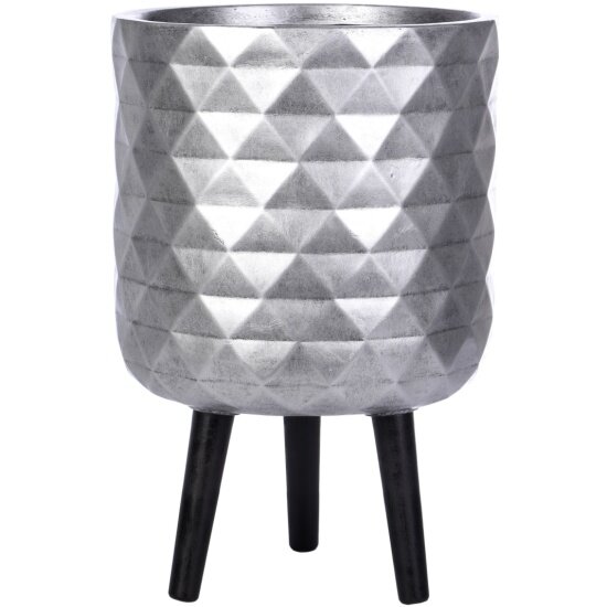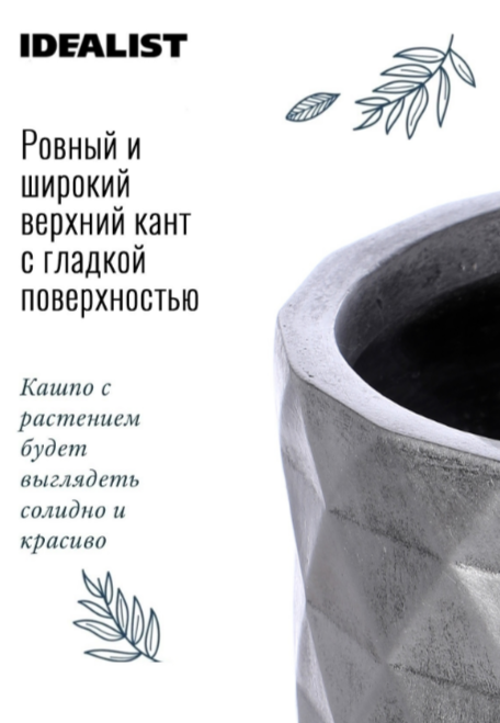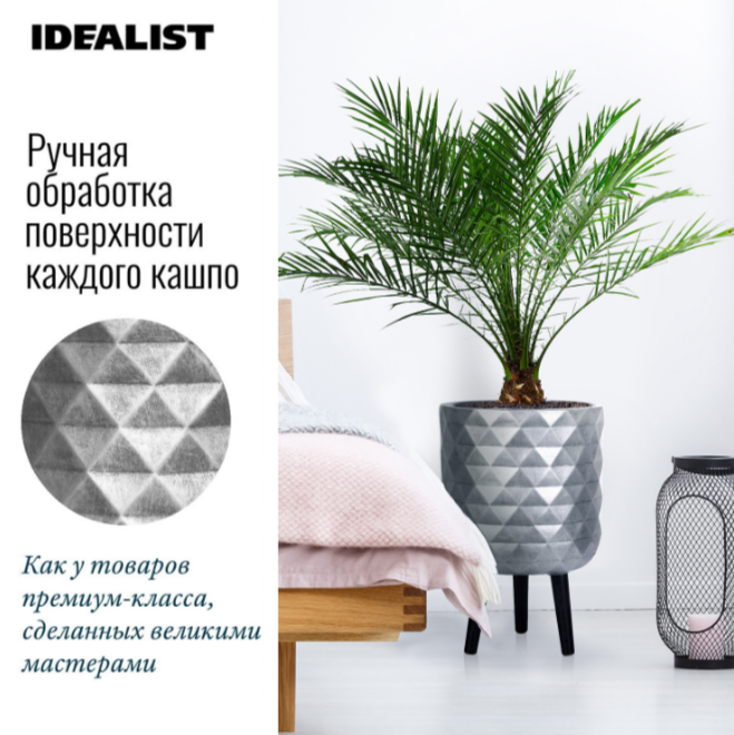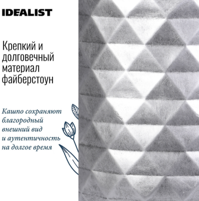 Инновационный материал файберстоун. Ультрамодная металлизированная поверхность в сочетании с эффектным орнаментом. Кашпо на ножках из натурального бука Легкий вес. Изготовлено вручную. Для интерьерного озеленения. Лучшие друзья растений - бриллианты Эффектным растениям необходимо шикарное кашпо! Коллекция "" филигранно подчеркнет красоту цветов и создаст роскошный акцент в интерьере. Рельеф в виде огранки подчеркивает мерцание благородных оттенков кашпо "".Высокая прочность и современный вид. В основе – инновационный качественный материал файберстоун. Благодаря этому прочному композитному материалу горшки сохраняют свои характеристики, благородный внешний вид и аутентичность на долгое время. На вершине дизайна. Эффектные поверхности, приятные фактуры и природные цвета идеально передают текстуру камня и впечатляют, увлекают, завораживают! Горшки IDEALIST LITE сделаны вручную. Поверхность может иметь следы ручной обработки в виде легких сколов или потертостей. Это придает горшкам естественность и свидетельствует о творческом процессе производства. С помощью рук гончаров рождаются настоящие шедевры! Выбор в разнообразии. Коллекции IDEALIST LITE - это десятки форм, стилей и размеров, которые станут современной основой для озеленения и дизайна любого пространства: и небольшой квартиры, и просторного дома, и крупных общественных помещений. Удобство перемещения. Не удивляйтесь, солидный внешний вид и высокое качество исполнения IDEALIST LITE не превращают их в громоздких тяжеловесов. Благодаря использованию современного материала файберстоун даже самые крупные горшки остаются вполне мобильными. Защита природы - материал может быть переработан. Используя горшки IDEALIST, вы заботитесь о нашем наследии, ведь горшки можно переработать и не загрязнять природу! Возможность дренажа. В ряде моделей на дне есть специальная метка, которая позволяет просверлить дренажное отверстие.
