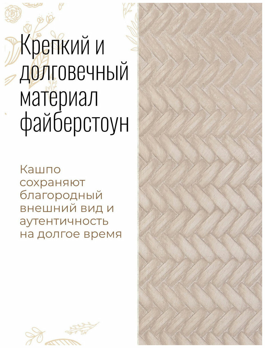 Инновационный материал файберстоун. Матовая текстура в сочетании с эффектным орнаментом. Легкий вес. Изготовлено вручную. Для интерьерного озеленения. Ваш эффектный зеленый оазис. Создавайте свою зону релакса. Оригинальный орнамент кашпо в виде плетения и природные оттенки - универсальный вариант для любого интерьера. Композиция растений в кашпо "" без сомнения станет центром внимания! Высокая прочность и современный вид. В основе – инновационный качественный материал файберстоун. Благодаря этому прочному композитному материалу горшки сохраняют свои характеристики, благородный внешний вид и аутентичность на долгое время. На вершине дизайна. Матовые поверхности, приятные фактуры и природные цвета идеально передают текстуру камня и впечатляют, увлекают, завораживают! Горшки IDEALIST LITE сделаны вручную. Поверхность может иметь следы ручной обработки в виде легких сколов или потертостей. Это придает горшкам естественность и свидетельствует о творческом процессе производства. С помощью рук гончаров рождаются настоящие шедевры! Выбор в разнообразии. Коллекции IDEALIST LITE - это десятки форм, стилей и размеров, которые станут современной основой для озеленения и дизайна любого пространства: и небольшой квартиры, и просторного дома, и крупных общественных помещений. Удобство перемещения. Не удивляйтесь, солидный внешний вид и высокое качество исполнения IDEALIST LITE не превращают их в громоздких тяжеловесов. Благодаря использованию современного материала файберстоун даже самые крупные горшки остаются вполне мобильными. Защита природы - материал может быть переработан. Используя горшки IDEALIST, вы заботитесь о нашем наследии, ведь горшки можно переработать и не загрязнять природу! Возможность дренажа. В ряде моделей на дне есть специальная метка, которая позволяет просверлить дренажное отверстие.