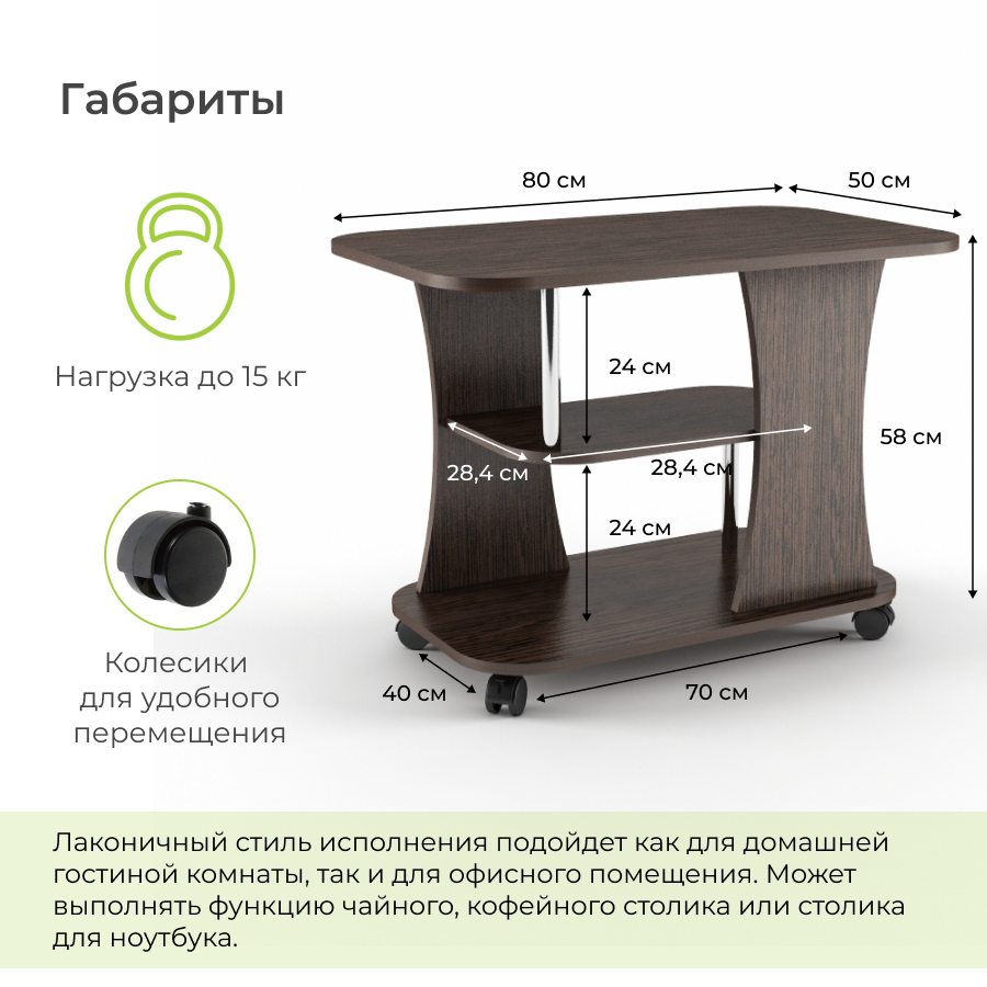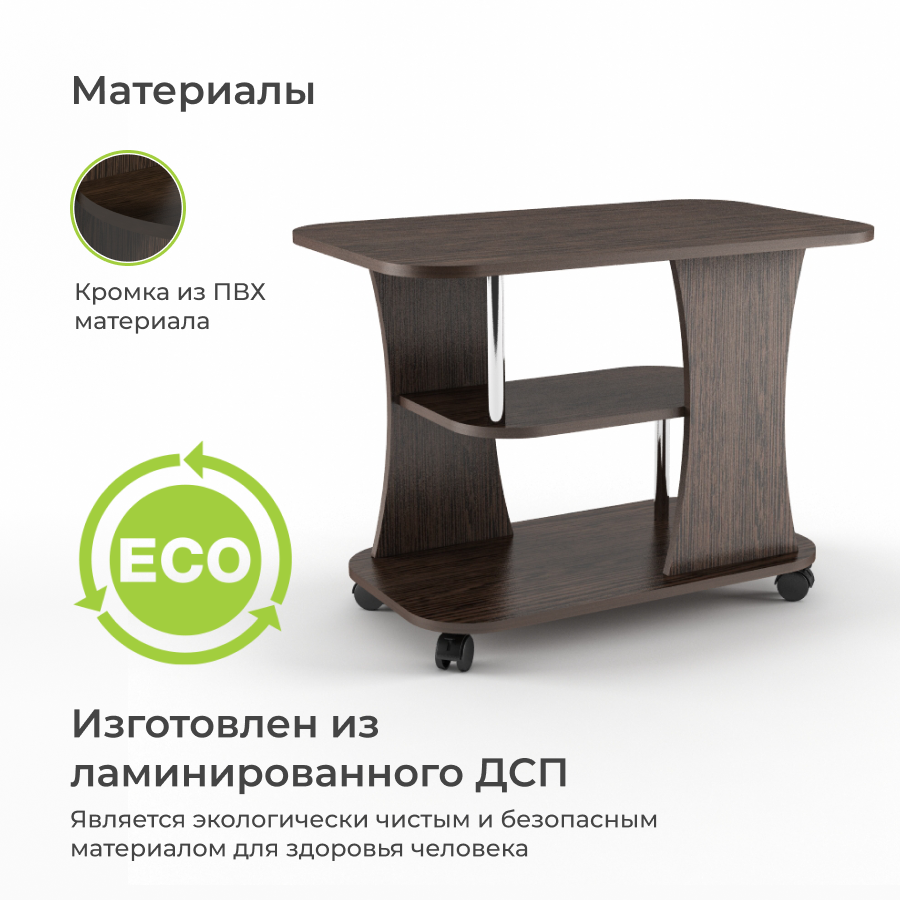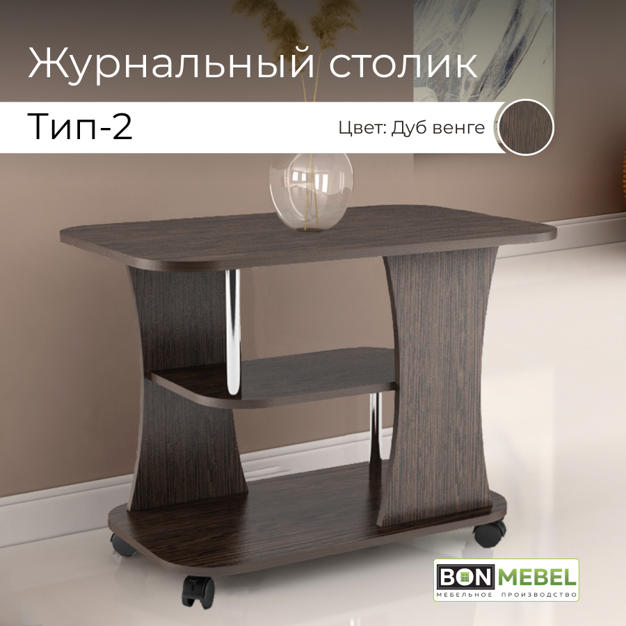 Журнальный столик БонМебель тип 5 станет стильным и практичным дополнением зоны отдыха.Столик оснащен удобными колесиками, благодаря чему его можно без труда передвигать по комнате.Лаконичный стиль исполнения подойдет как для домашней гостиной комнаты, так и для офисного помещения, может выполнять функцию чайного/кофейного столика или столика для ноутбука. Крепления скрыты декоративными заглушками в цвет изделия.Оригинальная конструкция добавляет ему функциональности, так как между основными поверхностями (верхней и нижней) есть свободное пространство, в которое вмонтированы две дополнительные полки для нужных или декоративных мелочей.Цвет - Дуб венге цаво. Корпус - ЛДСП. Размеры (Ш x Г x В) - 76,5 x 50 x 70 см.Диаметр столешницы 50 см.Нагрузка на стол - до 15 кг.Кромка ПВХ.ОБРАТИТЕ ВНИМАНИЕ! Столик будет неустойчив, если пользоваться основной столешницей без наполнения самого нижнего яруса.