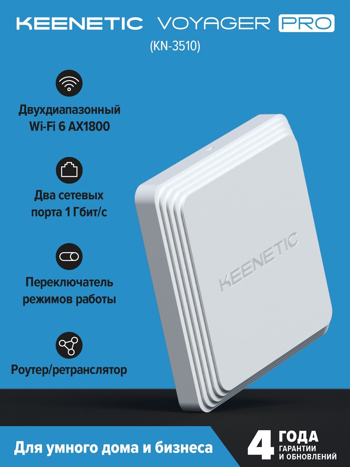 Маршрутизатор Keenetic Voyager Pro KN-3510 100/1000 1xWAN 1xLAN WiFi 802.11ax до 574 Мбит/с / 1201 Мбит/с (24 и 5 ГГц) Белый KN-3510-01RU (Keenetic Voyager Pro (KN-3510))