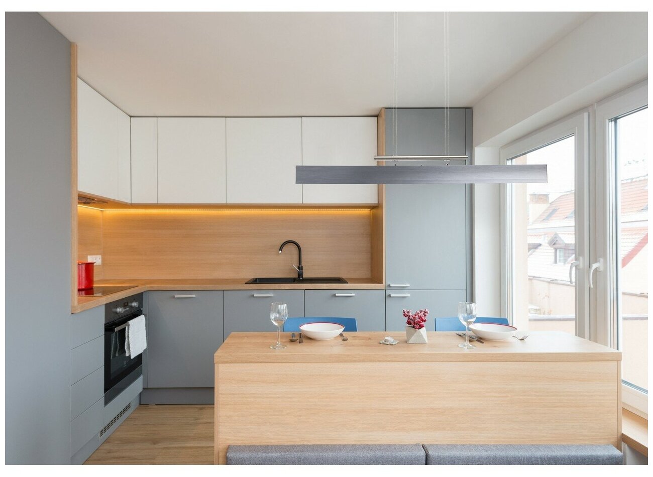 Современный минималистичный дизайн светильника из облегченного сплава металла.Специальная разработка для освещения столовых обеденных зон и рабочих островов с длиной световой поверхности 1,5 и 1,2 м.Регулировка высоты подвеса до 2,1 м с помощью ручного лифта.Мощные светодиоды обеспечивают большую площадь освещения, долговечны и экономичны.Плавное диммирование при удержании кнопки ВКЛ позволяет приглушать свет. Есть функция памяти настроек освещения.Светодиодные источники света безопасно оставлять включенными на ночь в режиме ночной подсветки.Выключатель на корпусе управляет одновременным включением верхнего и нижнего света.