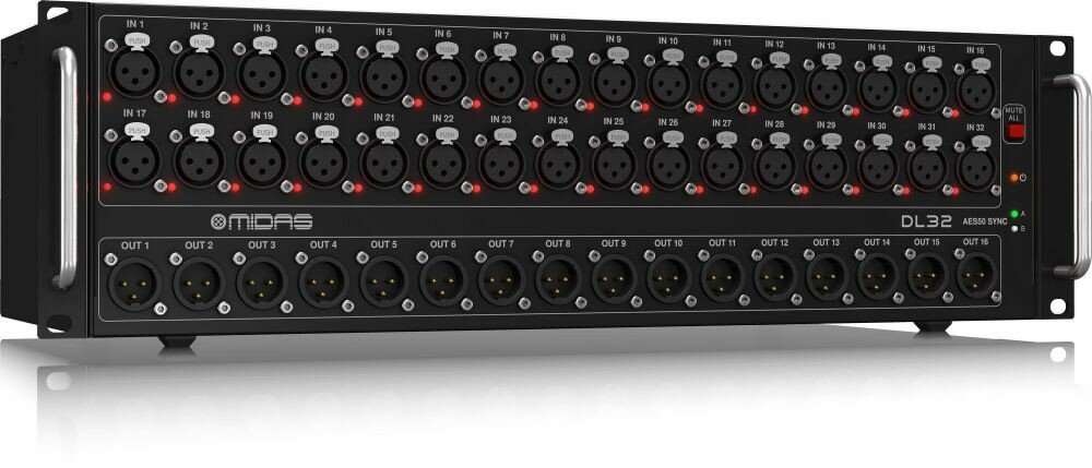 Стейдж-бокс для микшерной консоли Midas M32, рэковое и стационарное размещение, высота 3U. 32 входа и 16 линейных выходов, 32 микрофонных предусилителя Midas PRO. Подключение к сетям ULTRANET по кабелю Ethernet CAT5e длиной до 100 метров, порты AES50 для каскадного подключения нескольких . Два цифровых оптических выхода ADAT с 16 каналами, порты AES-3 для цифрового подключения, вход и выход MIDI.
