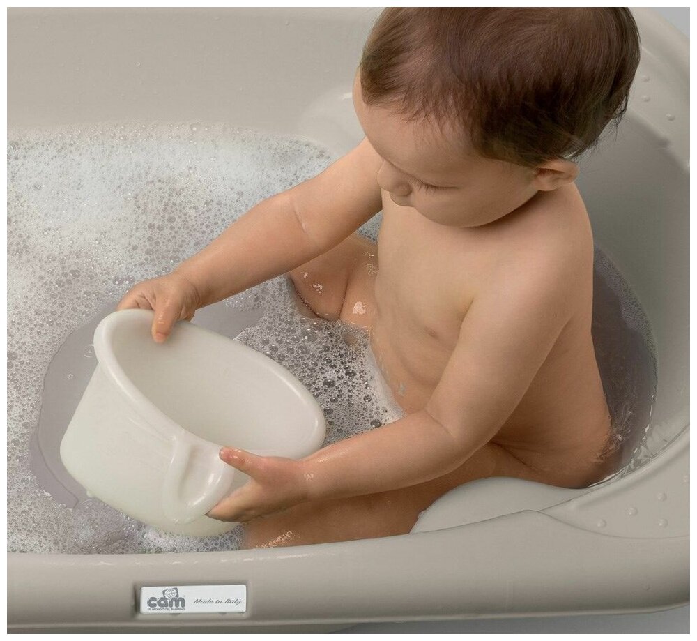 Ванночка Cam «» понадобится Вам сразу после рождения малыша и сделает ежедневное купание самой любимой процедурой. Ванночка имеет анатомическую форму, на внутренней поверхности предусмотрено удобное сиденье и подлокотники, полочка для гигиенических принадлежностей и сливное отверстие. Ванночку можно повесить на стену в ванной комнате. Вы также можете приобрести универсальную складную подставку и располагать на ней ванночку во время купания.