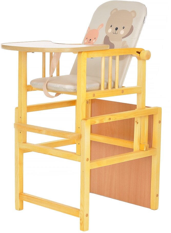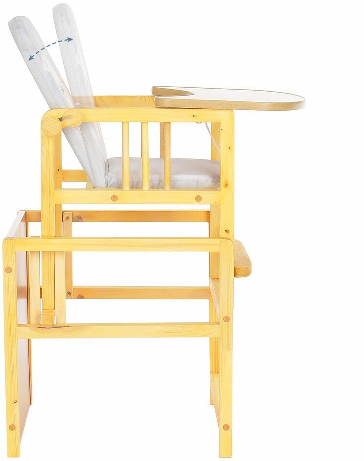 Детский стул-стол для кормления предназначен для детей от полугода до пяти лет. Представленная модель трансформируется в устойчивый столик с просторной столешницей и мягкий стульчик для детского творчества и настольных игр. Для этого потребуется лишь снять столешницу. Спинка сидения ( регулируется) может устанавливаться под удобным для ребенка углом, также имеют возможность регулировки столешница и подножка. Надежный, крепкий и устойчивый каркас изготовлен из массива сосны и березы, покрыт несколькими слоям