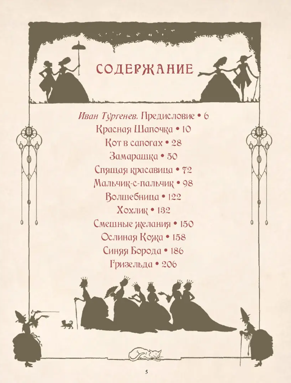 Во-первых, девять самых знаменитых сказок Перро ("Красная Шапочка", "Спящая красавица", "Кот в сапогах", "Мальчик-с-Пальчик" и т. д.) публикуются в переводе русского классика - Ивана Тургенева.