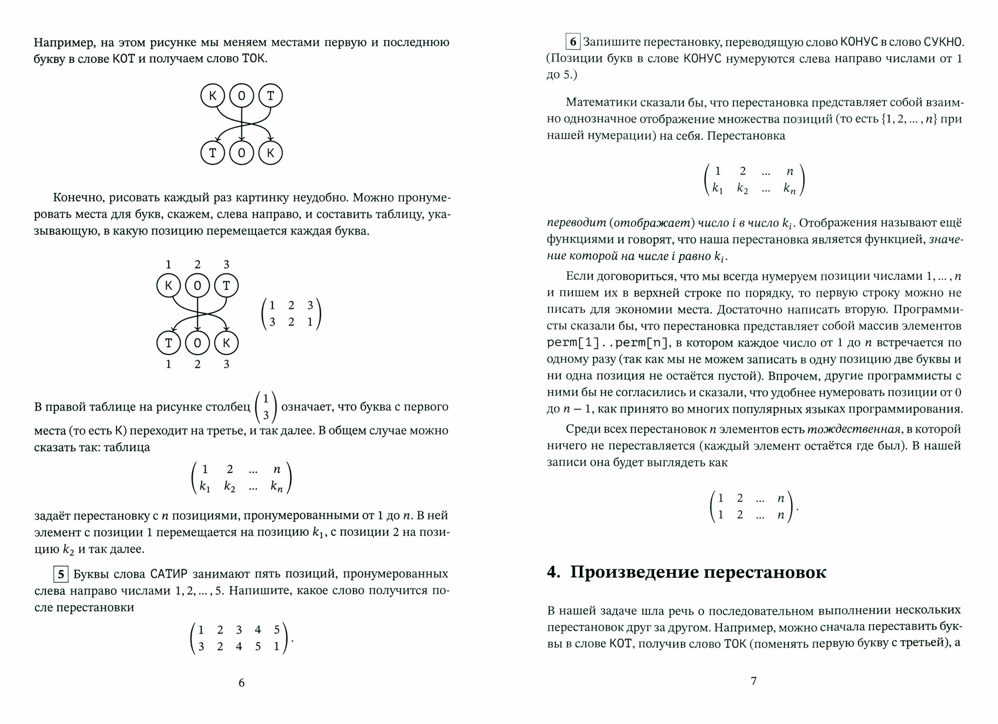 В жизни «перестановками» называют самые разные вещи; эта книжка содержит начальные сведения о том, что математики называют «группой перестановок конечного множества». Мы покажем, как можно разделить перестановки на «чётные» и «нечётные» и как это помогает проанализировать известную головоломку c 15 фишками в квадрате 4x4, как перестановка разлагается в циклы и почему это бывает полезно, почему повторение одного и того же действия с «кубиком ...(Подробнее)Рубика» рано или поздно вернёт его в исходное положение, и разберём задачи, при решении которых перестановки оказываются полезными. Обычно эти вопросы относят к курсам «высшей алгебры» для студентов младших курсов, но они вполне элементарны, и никаких сведений, выходящих за пределы средних классов школы, мы не используем. (Хотя, конечно, привычка к несложным математическим рассуждениям пригодится.)
