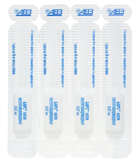 | Условия хранения | хранить в закрытой упаковке производителя, в защищенном от света и влаги месте, отдельно от продуктов питания и кормов, при температуре от +5°C до +30°C. Капли инсектоакарицидные «Барс» следует хранить в местах недоступных для детей |