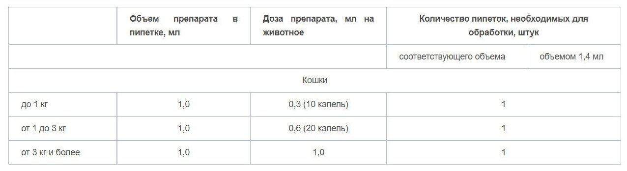 Способ применения: применяют однократно путем точечного капельного нанесения на сухую неповрежденную кожу в местах, недоступных для слизывания животным в несколько точек вдоль позвоночника (от ушей до области между лопатками и вдоль спины), избегая попадания препарата на шерсть.