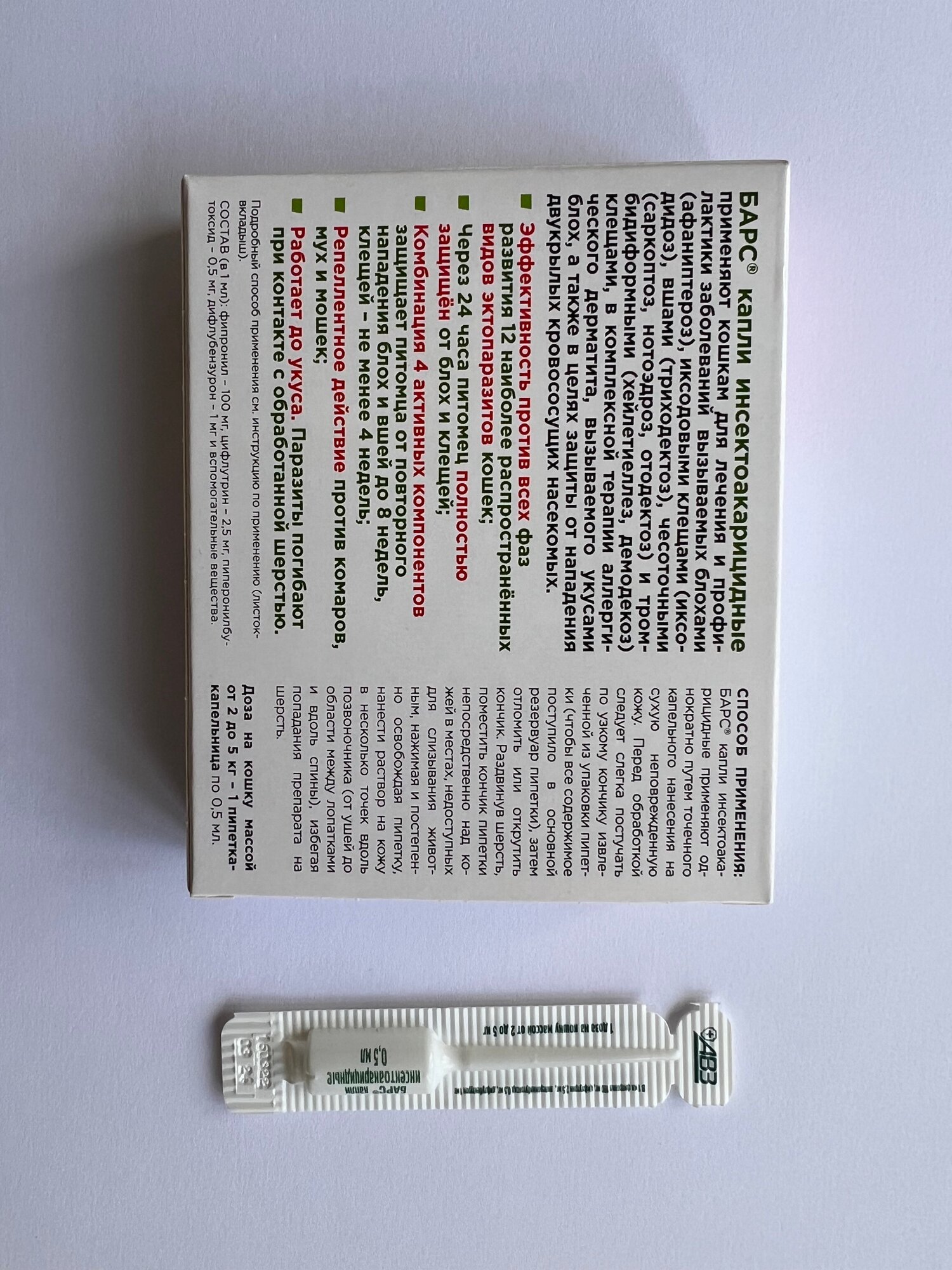 | Состав | Состав препарата БАРС капли инсектоакарицидные для кошек: фипронил – 100 мг/мл (10 %) – увеличили концентрацию максимально безопасного для теплокровных инсектоакарицидного компонента; цифлутрин – 0,25% (2,5 мг/мл) – инсектоакарицидный и репеллентный компонент; пиперонилбутоксид – 0,05% (0,5 мг/мл) – синергист, улучшает проникновение инсектоакарицидных действующих веществ через кутикулу членистоногого; дифлубензурон – 0,1 % (1 мг/мл) – ингибитор хитина паразитов. |