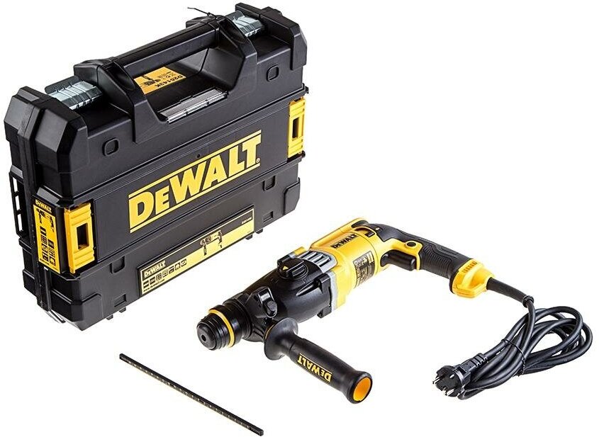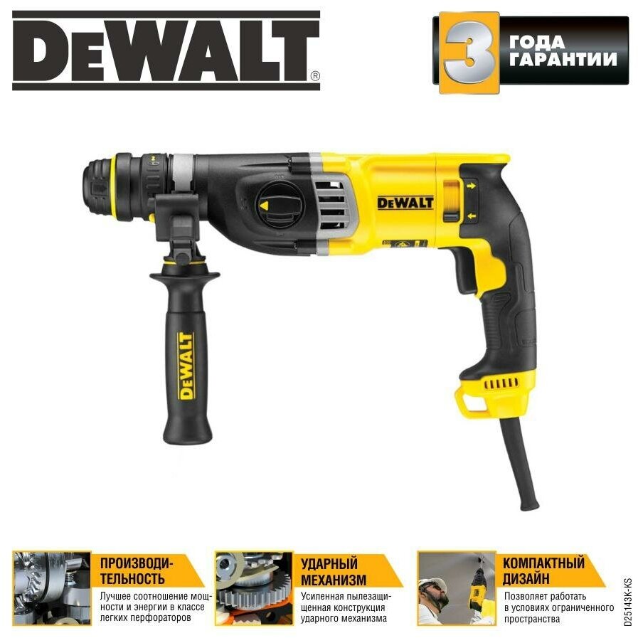 DEWALT - сетевой перфоратор для ремонта и стройки. Мощность 900 Вт, максимальная энергия удара 3,2 Дж. Работает в трёх режимах: сверления с ударом и без, а также долбления. В ударном режиме бурит бетон, камень и кирпич, в безударном сверлит дерево и металл.