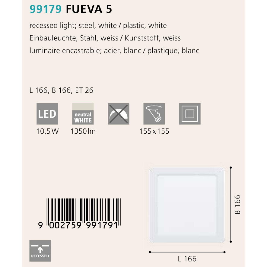 Встраиваемый светильник светодиодный Fueva 5 - продукт известной компании Eglo (Австрия). Имеет максимальную мощность 5.5 Вт, освещает площадь до 1.1 кв. м. Отлично подойдет для таких мест, как гостиная, прихожая и коридор, кафе, кухня, кабинет, офис, магазин. Впишется в интерьеры следующих стилей: современный.