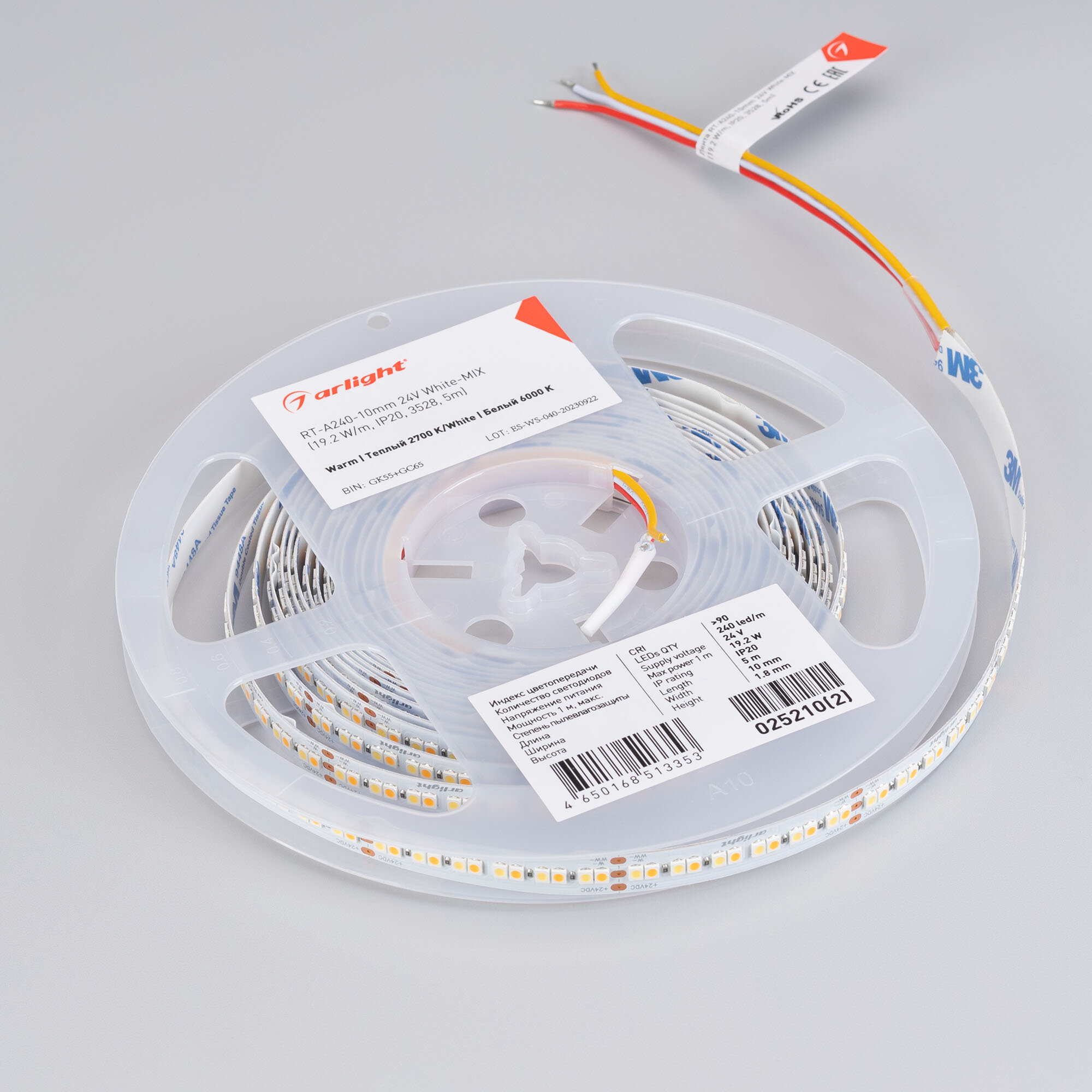 | Номенклатура | Лента RT-A240-10mm 24V White-MIX (19.2 W/m, IP20, 3528, 5m) (ARL, Открытый) |