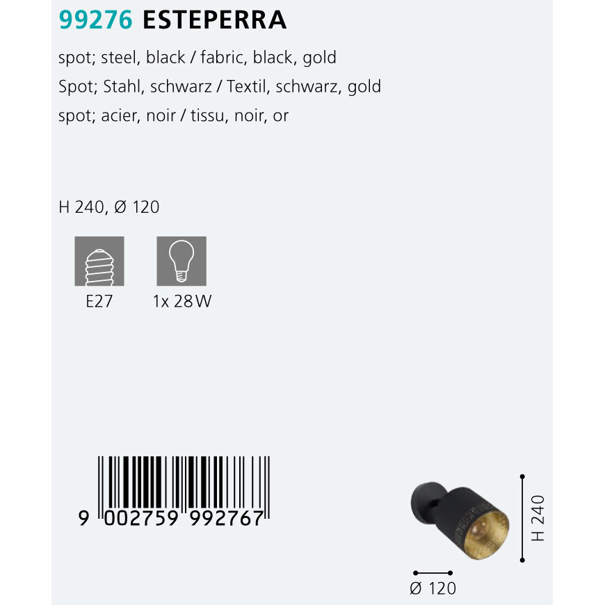 Спот с одним плафоном Eglo серии ESTEPERRA. Будет хорошим решением для квартиры. Размеры 14x9x24 cm. Параметры пылевлагозащиты IP — 20. Плафон текстильный черного цвета, а материал/цвет арматуры сталь/черный. Использует лампу с цоколем E27. Страна происхождения бренда — АВСТРИЯ.