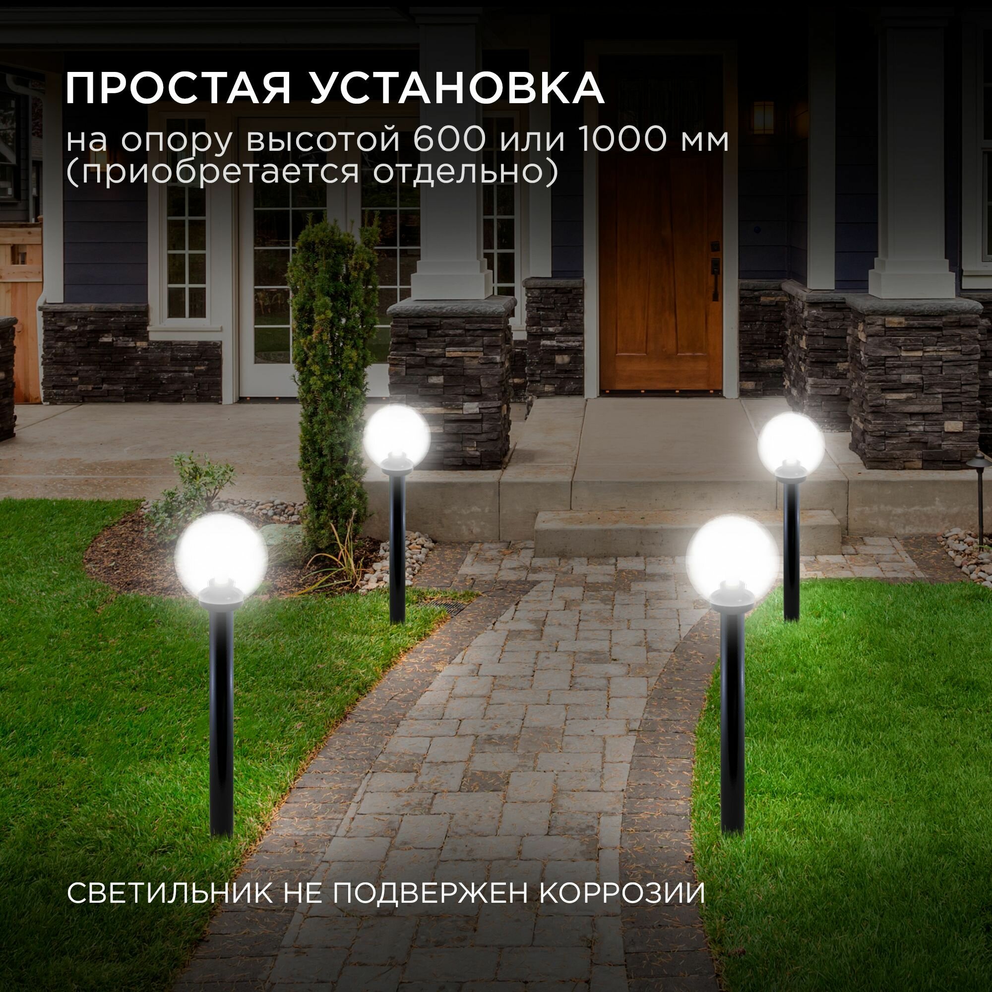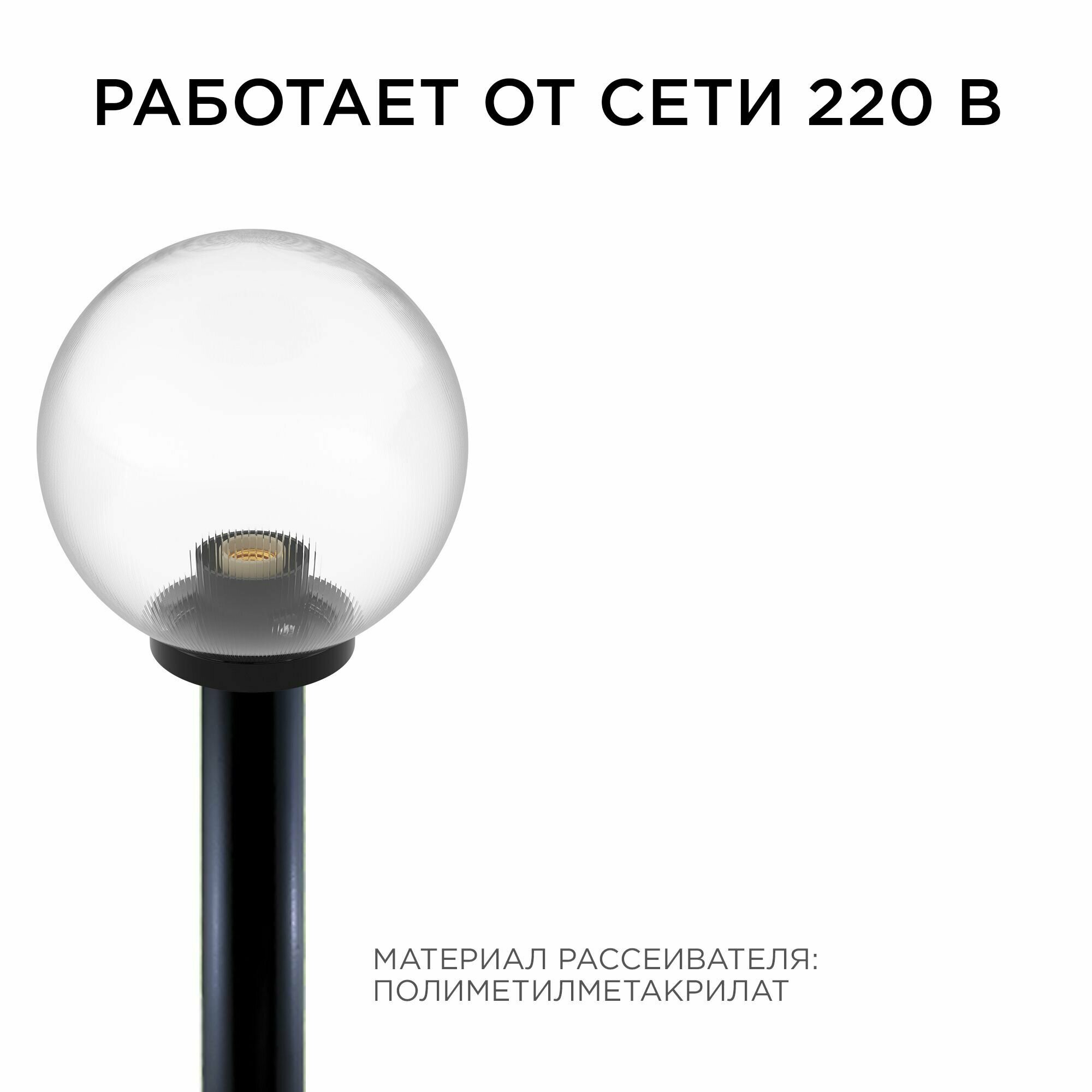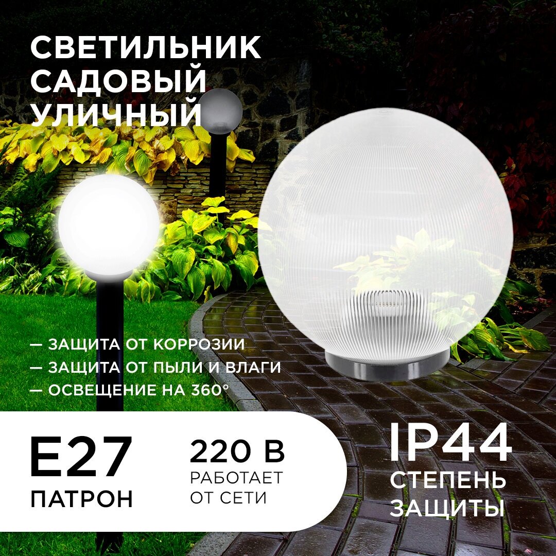Садово-парковый светильник с артикулом выполнен в форме шара. Отлично дополняет окружающее пространство, а кроме этого создает освещение практически на все 360°. Основание светильника изготовлено из поликарбоната, а рассеиватель ― из полиметилакрилата. Материалы светильника показывают отличную устойчивость к механическим повреждениям, а также воздействию температуры и солнечного света. Он будет долго радовать глаз и освещать окружающее пространство. Рассеиватель прозрачный, и благодаря этому потери от источника свечения минимальны, а призматическая насечка светильника создаст оригинальное свечение вокруг. Основание имеет классический черный цвет, который легко впишется в любую обстановку. Данное изделие имеет универсальный способ монтажа. Это значит, что светильник можно смонтировать на поверхность напрямую, а также с помощью дополнительно приобретенной стойки или настенного крепежа. В качестве источника свечения допустимо использовать лампы накаливания мощностью до 60 Вт и патроном Е27, энергосберегающие же лампы ограничены только размером, который можно разместить в корпусе светильника. Таким образом, есть возможность подобрать любой подходящий по яркости и цвету источник свечения, а самое главное, что в любое время его можно заменить. Светильник работает от сети 220 Вольт и не требует дополнительных устройств при подключении.