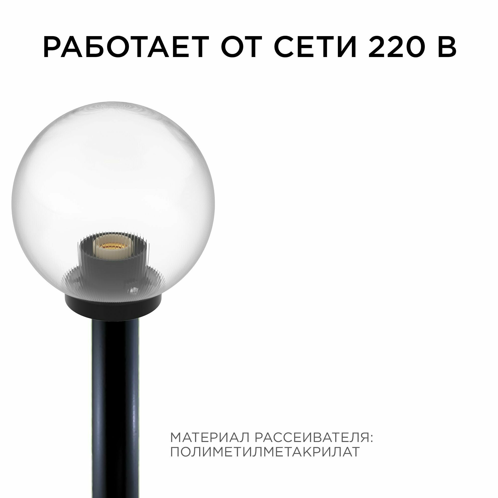 Садово-парковый светильник с артикулом выполнен в форме шара. Отлично дополняет окружающее пространство, а кроме этого создает освещение практически на все 360°. Основание светильника изготовлено из поликарбоната, а рассеиватель ― из полиметилакрилата. Материалы светильника показывают отличную устойчивость к механическим повреждениям, а также воздействию температуры и солнечного света. Он будет долго радовать глаз и освещать окружающее пространство. Рассеиватель прозрачный, и благодаря этому потери от источника свечения минимальны, а призматическая насечка светильника создаст оригинальное свечение вокруг. Основание имеет классический черный цвет, который легко впишется в любую обстановку. Данное изделие имеет универсальный способ монтажа. Это значит, что светильник можно смонтировать на поверхность напрямую, а также с помощью дополнительно приобретенной стойки или настенного крепежа. В качестве источника свечения допустимо использовать лампы накаливания мощностью до 60 Вт и патроном Е27, энергосберегающие же лампы ограничены только размером, который можно разместить в корпусе светильника. Таким образом, есть возможность подобрать любой подходящий по яркости и цвету источник свечения, а самое главное, что в любое время его можно заменить. Светильник работает от сети 220 Вольт и не требует дополнительных устройств при подключении.преимущества:- Легкий корпус.- Не подвержен коррозии.- Сохраняет внешний вид и не выгорает в течении всего срока службы.- Стандартный патрон позволит использовать как стандартные, так и энергосберегающие лампы.- Есть возможность легко заменить источник свечения.- Светильник легко собрать и смонтировать.
