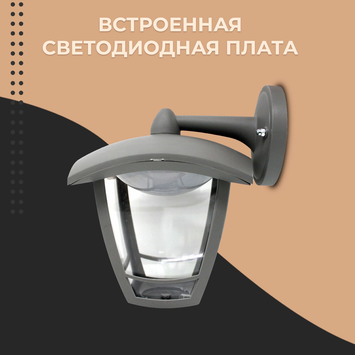 Светодиодный садово-парковый светильник с артикулом выполнен в классическом стиле, который является универсальным. Добавит шарм в любую обстановку. Корпус изготовлен из пластика, а рассеиватель выполнен из поликарбоната. Материалы устойчивы к механическим повреждениям, а также воздействию температуры и солнечного света. Рассеиватель прозрачный, и благодаря этому потери от источника свечения минимальны. Корпус имеет классический серый цвет, который легко впишется в любую обстановку. Изделие предназначено для крепежа на вертикальную поверхность и может быть смонтировано на стену или другое аналогичное место. Источником свечения в данном светильнике выступает светодиодная матрица с мощностью потребления 8 Вт. Она излучает световой поток равный 720 Лм с цветовой температурой 6500 К, что соответствует холодному белому цвету свечения. Светильник работает от сети 220 Вольт и не требует дополнительных устройств при подключении.преимущества:- Легкий корпус.- Не подвержен коррозии.- Долгий срок службы.- Встроенная светодиодная плата позволит не беспокоиться о замене ламп.- Легко монтируется.