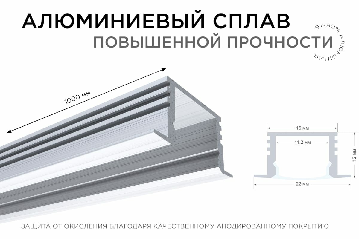 Алюминиевый профиль для светодиодной ленты по своей конструкции является встраиваемым, что позволяет встраивать профиль со светодиодной лентой в различные пазы и ниши, а декоративные фланцы прикроют края пазов, скрывая изъяны и создавая безукоризненный внешний облик. Для более крупных моделей профиля можно приобрести дополнительные крепежные пружины, чтобы сделать конструкцию еще надежнее. Данная модель алюминиевого профиля имеет размер 22х12х1000мм, и внутри него можно разместить светодиодную ленту шириной до 10мм. В алюминиевый профиль уже установлен рассеиватель белого цвета, изготовленный из светорассеивающего поликарбоната. Такой рассеиватель пропускает 70% светового потока и делает его более мягким и приятным для Ваших глаз, благодаря чему наиболее часто используется для решения и декоративных задач, и задач по организации основного освещения. Также в комплекте с профилем идут заглушки в количестве 2-х шт. Благодаря дробеструйной обработке профиль имеет приятную матовую поверхность, а анодирование сохранит благородный серебристый цвет, защищая профиль от окисления и создавая атмосферу, способствующую гармонии.