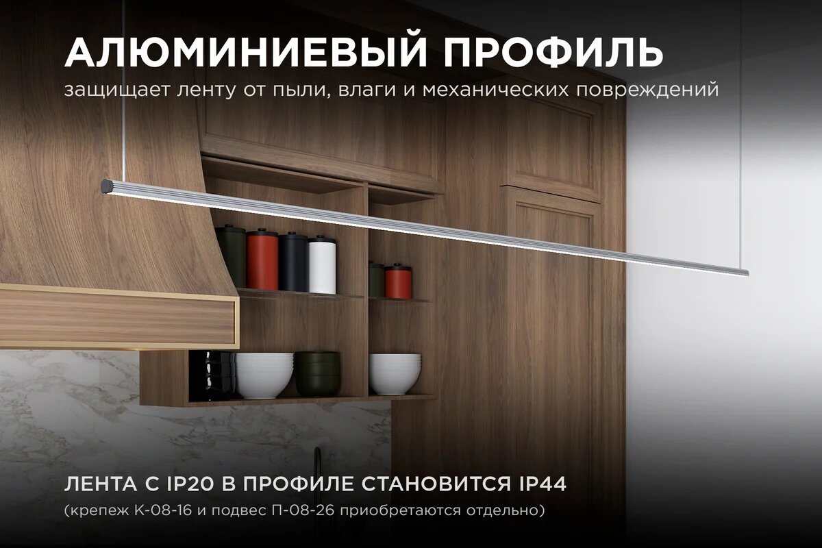 **Профиль для светодиодной ленты накладной Apeyron ** П-образный универсальный подходит для размещения на поверхности или крепления на подвесы. Позволяет разместить светодиодную ленту на поверхности мебели (полок, шкафов), стен и ниш, на лестницах. Состоит из корпуса и прозрачной наружной планки, рассеивающей лучи света. Монтируется в выбранном месте дома или офиса на двусторонний скотч, клей, жидкие гвозди или саморезы. Продлевает срок службы ленты, защищая ее от пыли, влаги и механических повреждений.