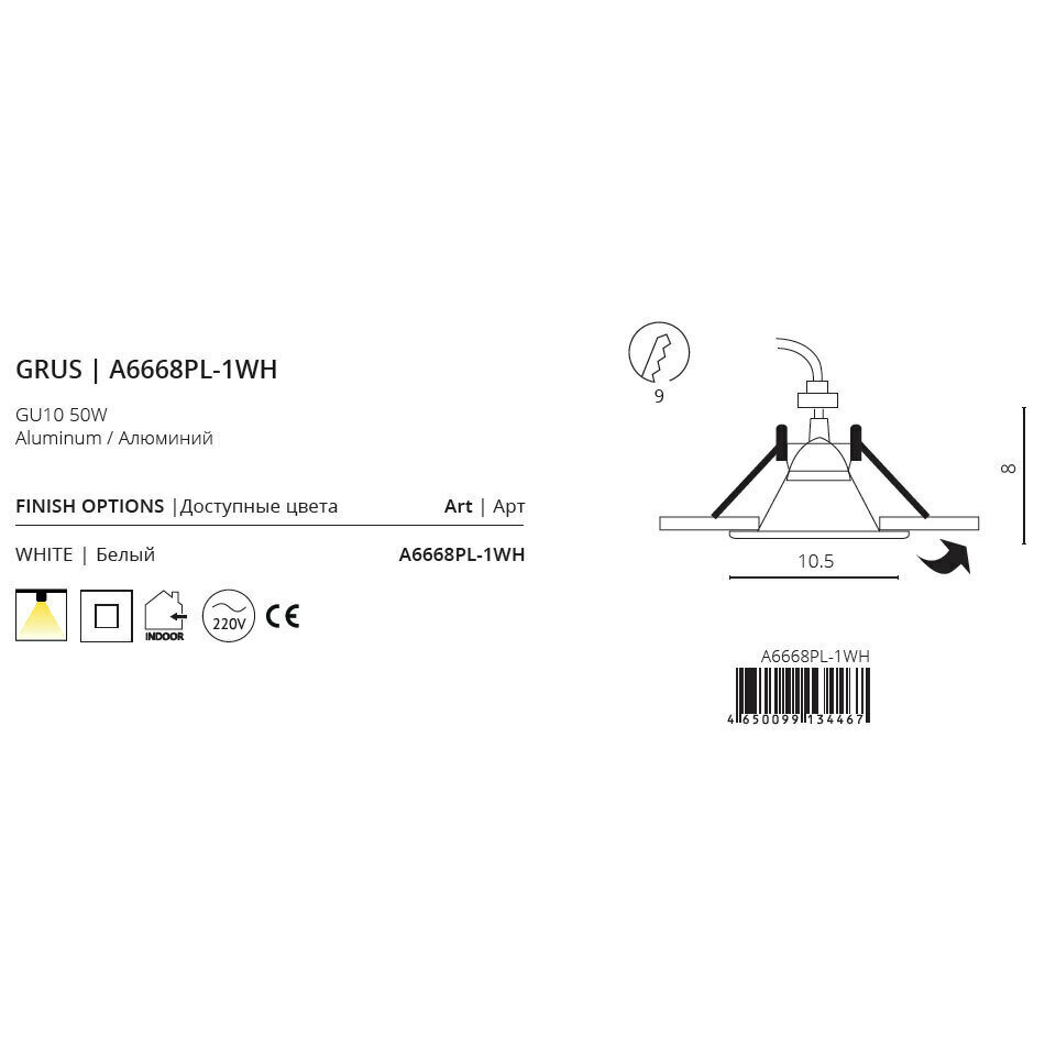 Светильник Artelamp серии Grus. Подчеркнет стиль помещения. Размеры 10.5x10.5x8 cm. Параметры пылевлагозащиты IP — 20. Материал/цвет арматуры алюминий/белый. Использует 1 лампу с цоколем GU10. Страна происхождения бренда — Италия.